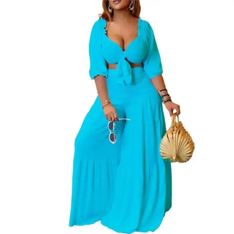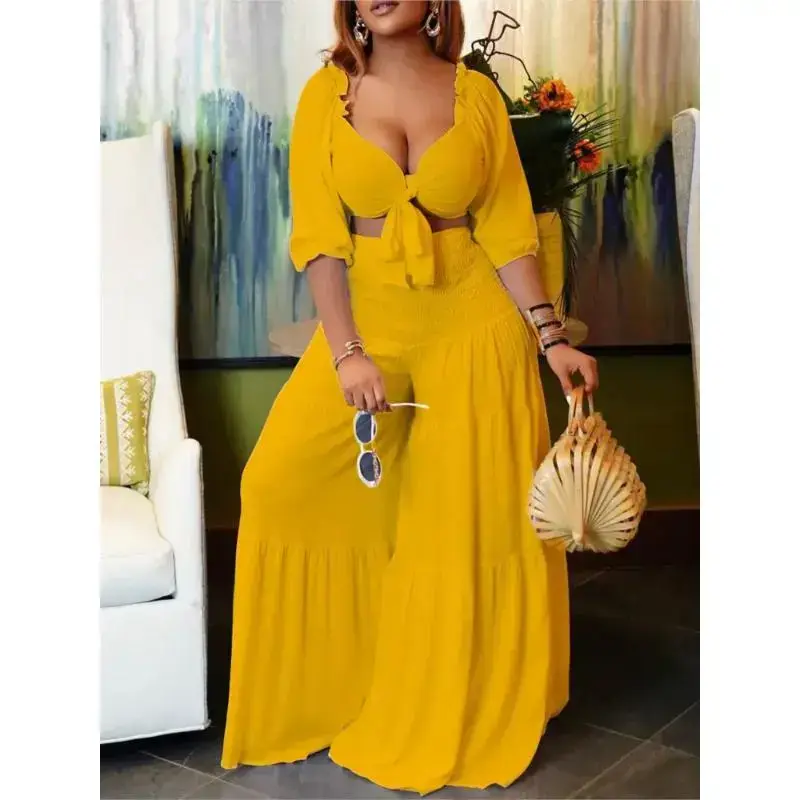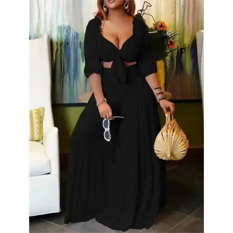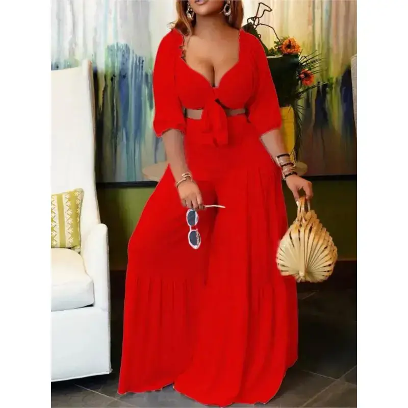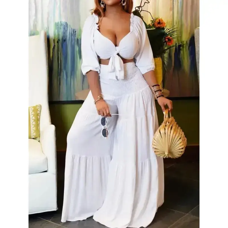 summer spring clothes 2025 Summer Plus Size 2 Piece Sets Women Sexy Fashion Elegant Party V Neck Backless Low Cut Tops High Waist Wide Leg Pants Set