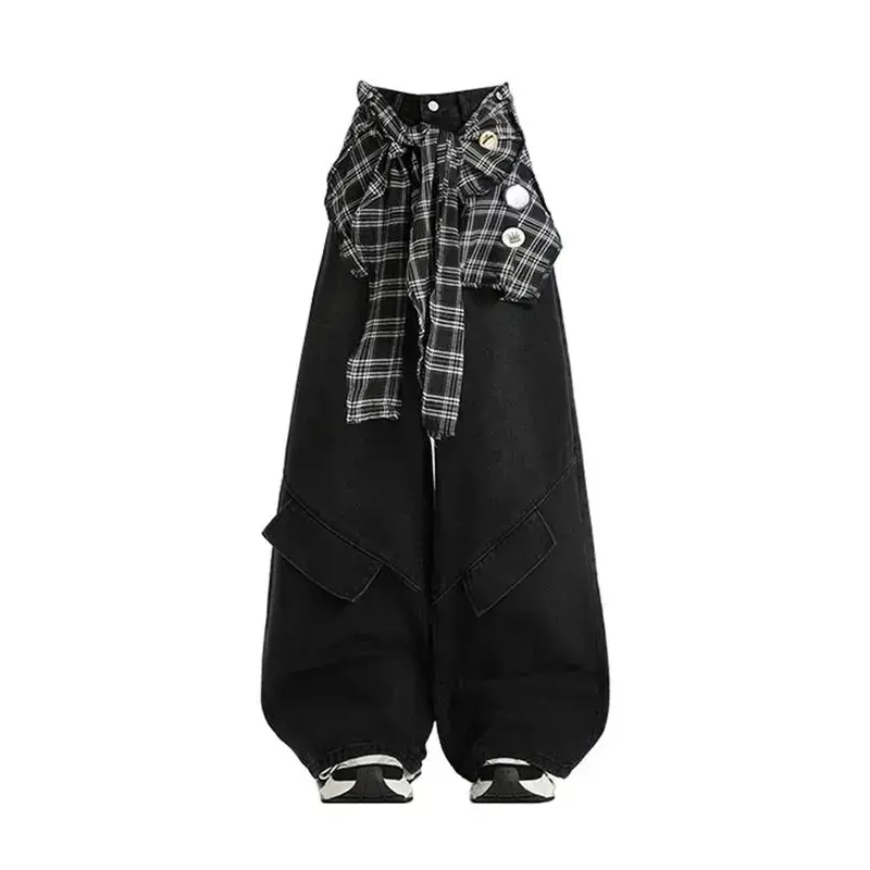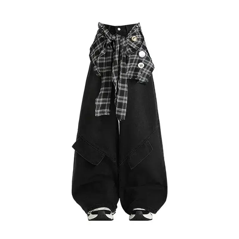 Women Black Gothic Y2k Oversize Cargo Jeans Pants with Wrap Skirt Harajuku Vintage Emo Japanese 2000s Style Baggy Denim Trousers