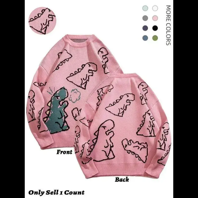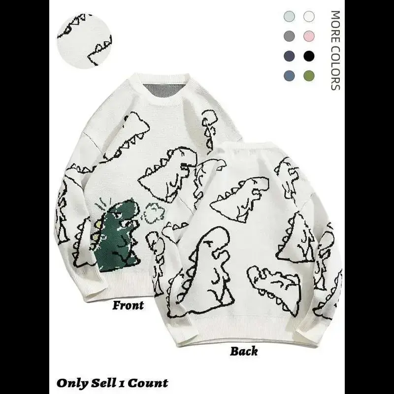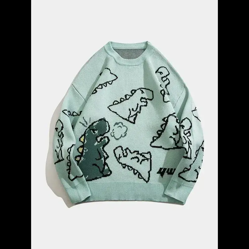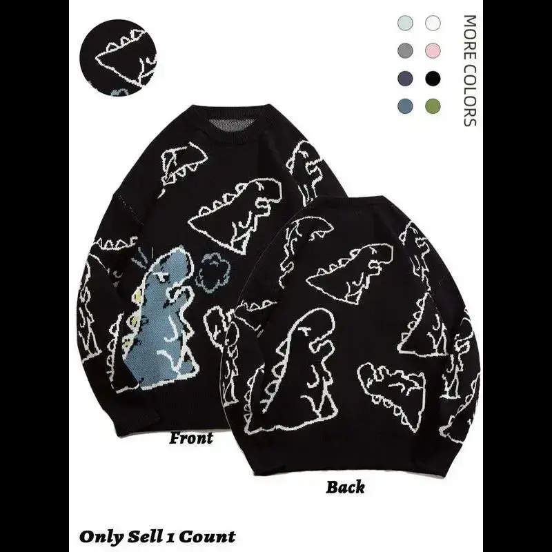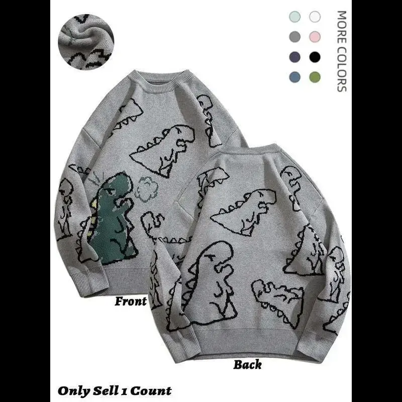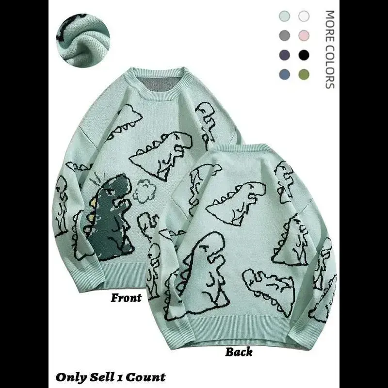 [Loose-fitting]: Engineered for relaxation and freedom of movement, our round neck sweater offers a loose fit perfect for any casual setting./[Dinosaur Theme]: Dive into a prehistoric adventure with the distinctive dinosaur pattern, transforming a classic knit into a conversation piece./[Medium Stretch]: Crafted with medium stretch viscose material, it provides a comfortable balance between flexibility and shape retention./[Knit Craftsmanship]: Our sweater is a product of skilled knitting, presenting a seamless, durable design that withstands the rigors of daily wear./[Versatile Wear]: Ideal for both men and women, this piece is a versatile addition to any Fall & Winter wardrobe, blending seamlessly with various styles.