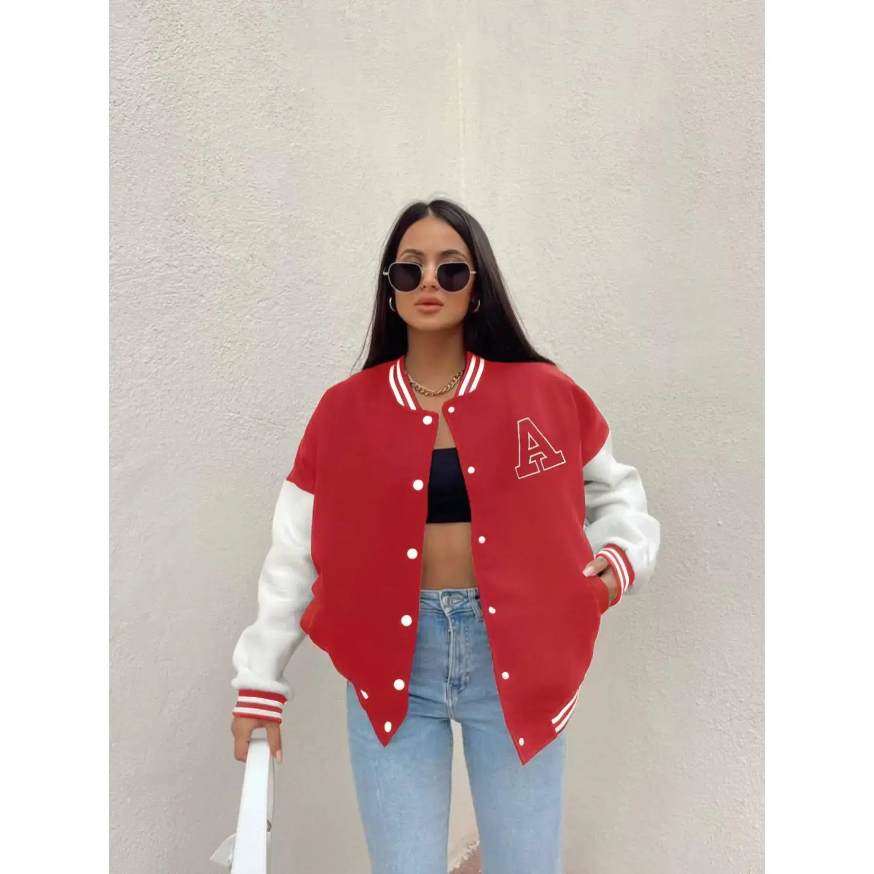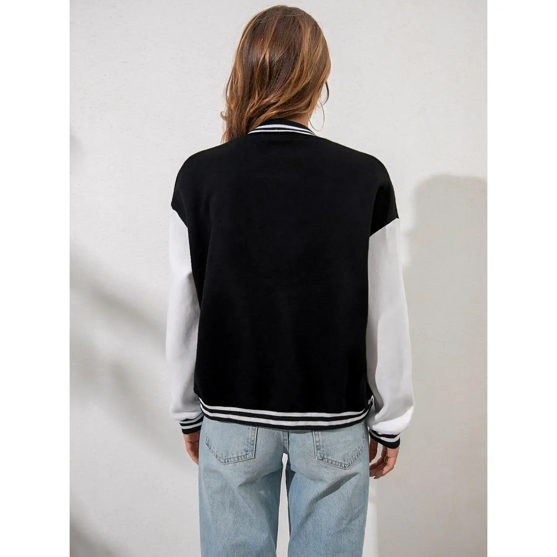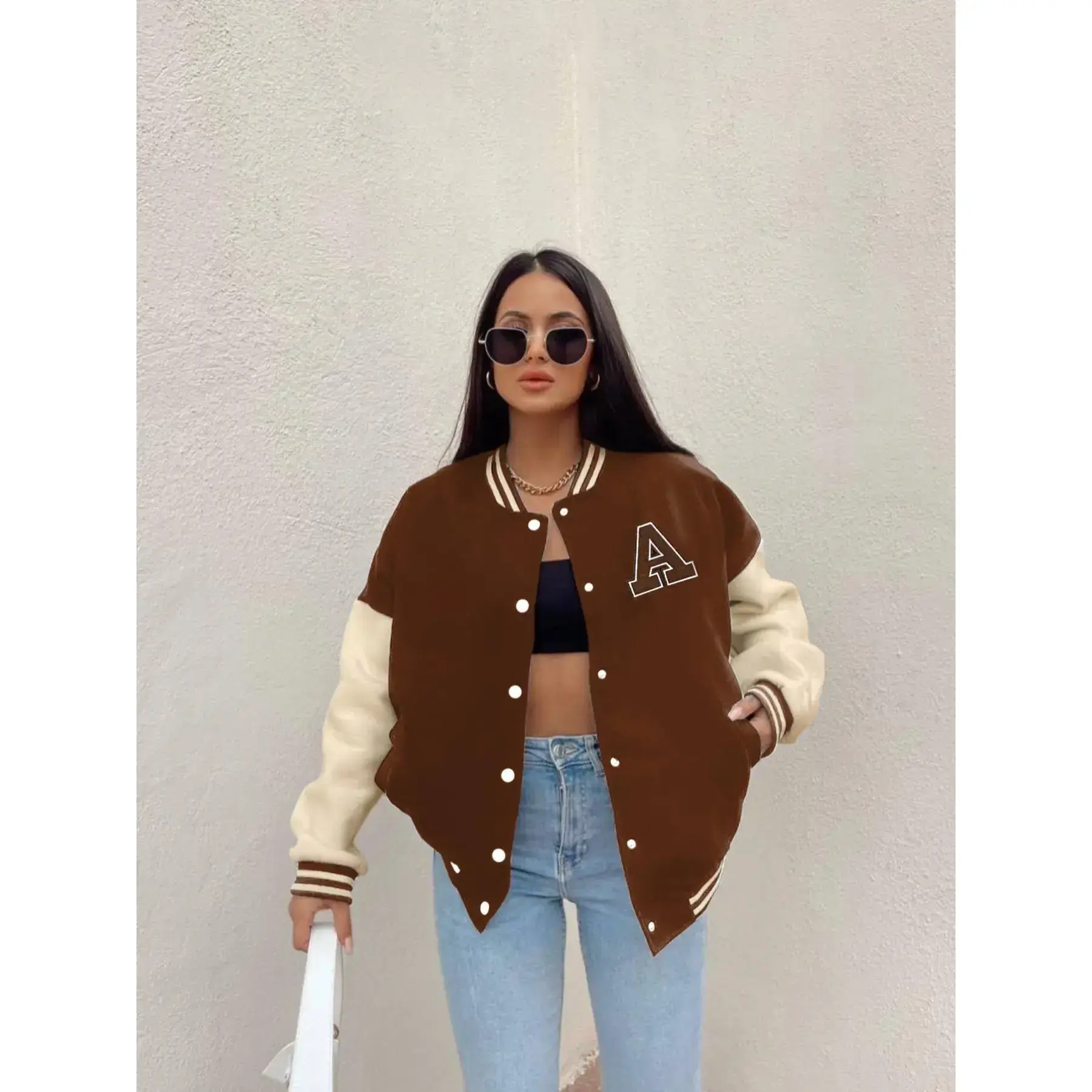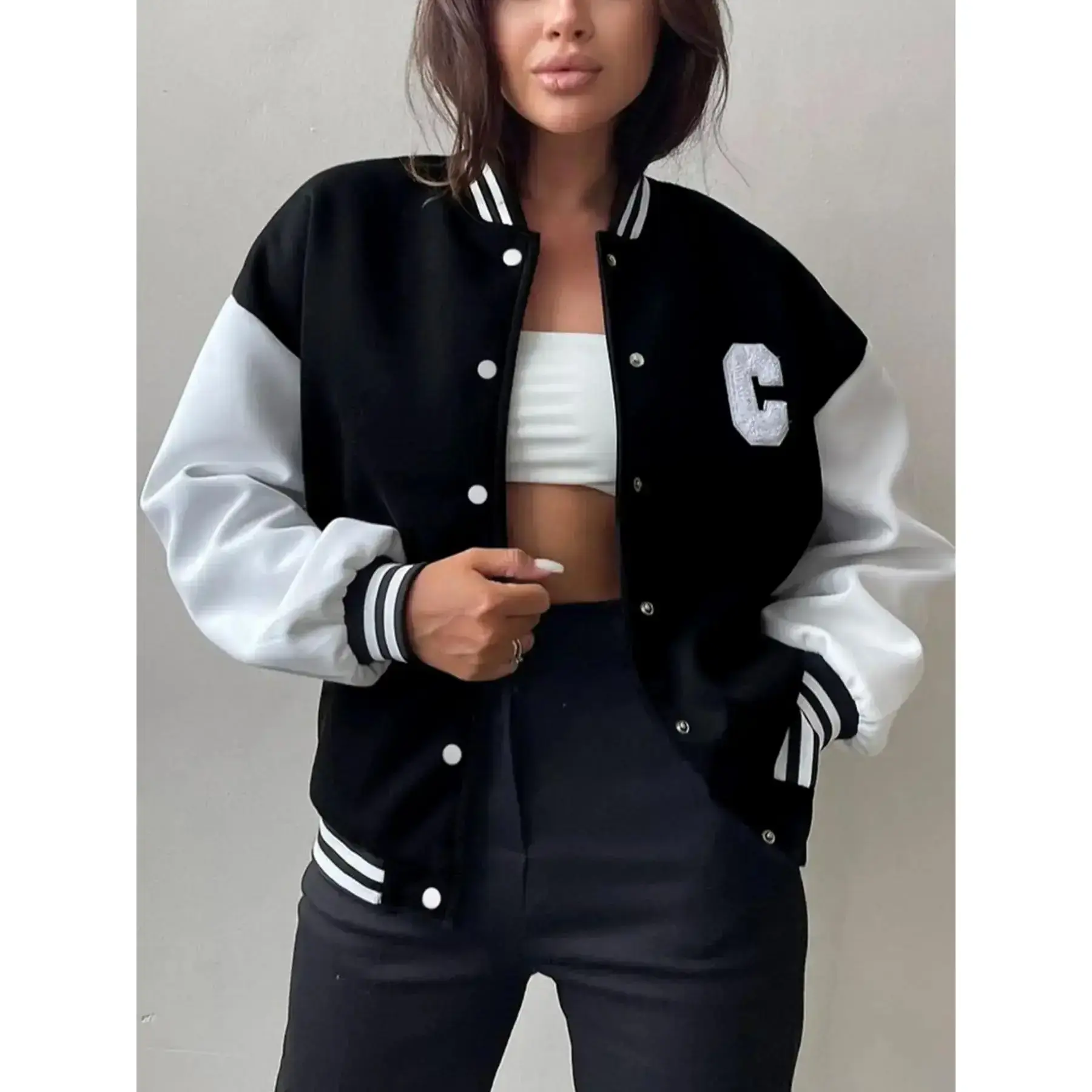 Women's Letter Patched Long Sleeve Collared Jacket, Jackets for Women, Sports Jacket, Lady Button Front Varsity Jacket, Preppy Casual Mock Neck Outerwear, Cozy Fall Outfits, Womenswear Casual Jacket Downtown Girl Clothes, Coat for Women