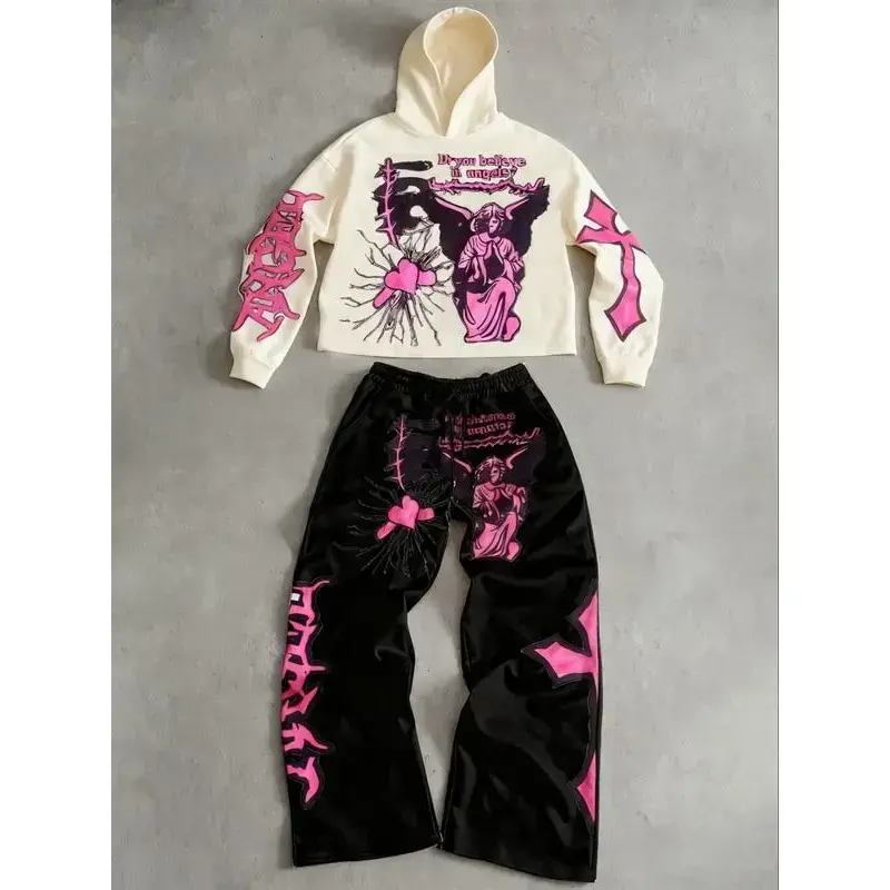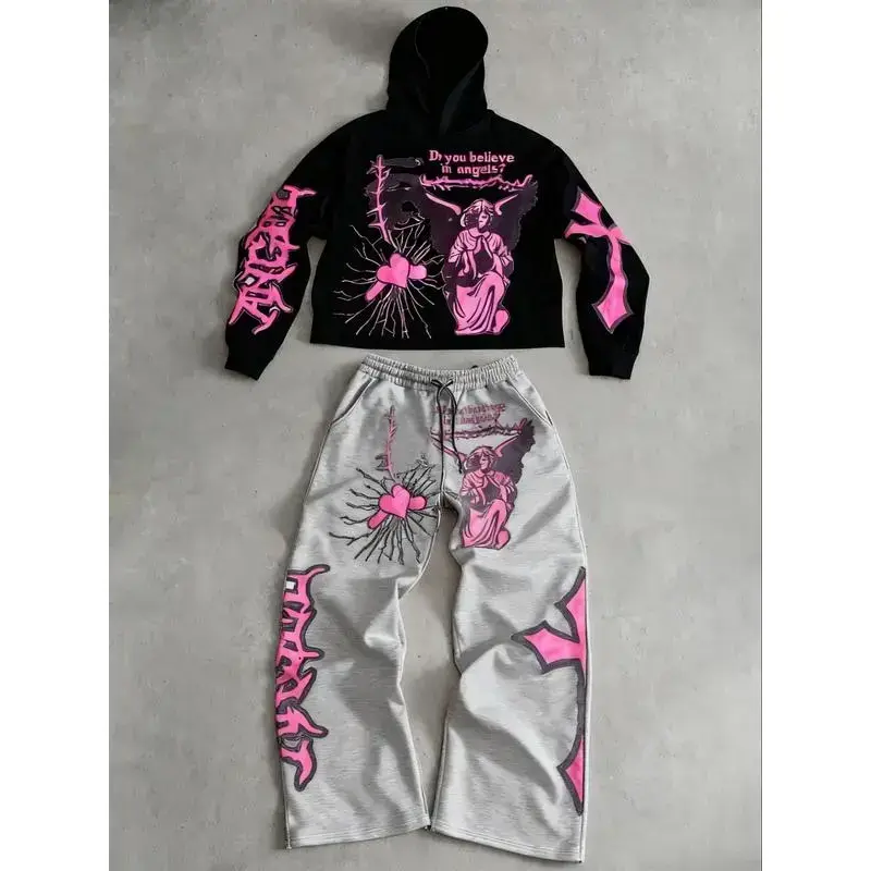 TikTok Sensation! Black Hoodie & Sweatpants Set with Eye - Catching Pink Angelic Prints, Ideal for Streetwear and Casual Fashion(Raincoats)