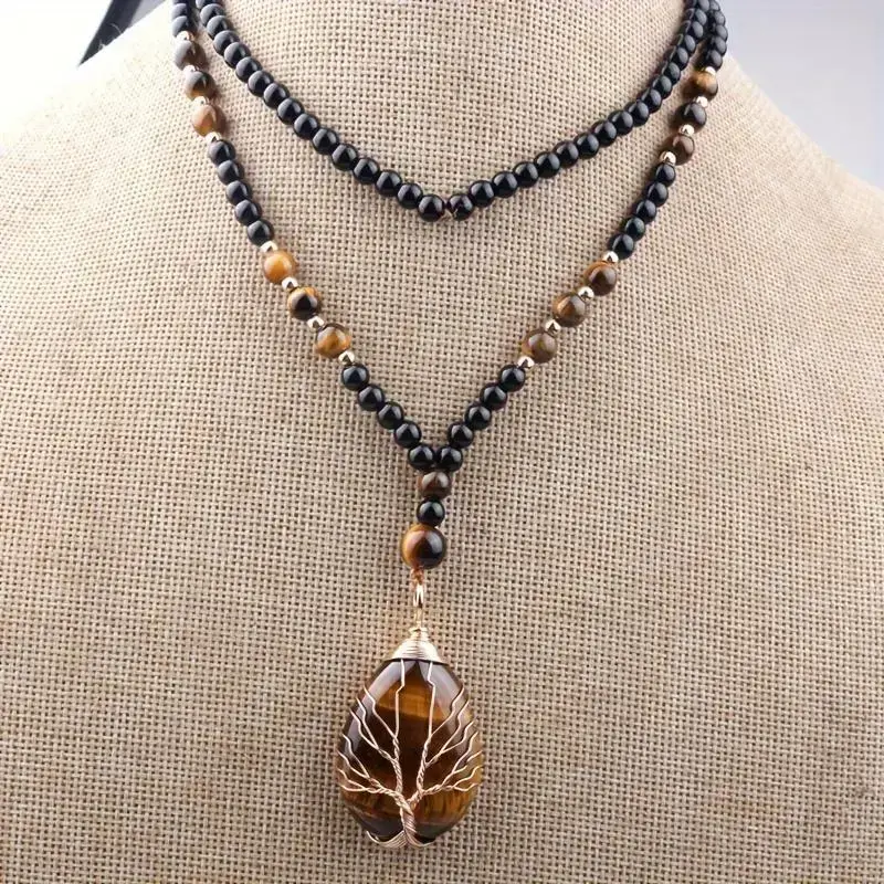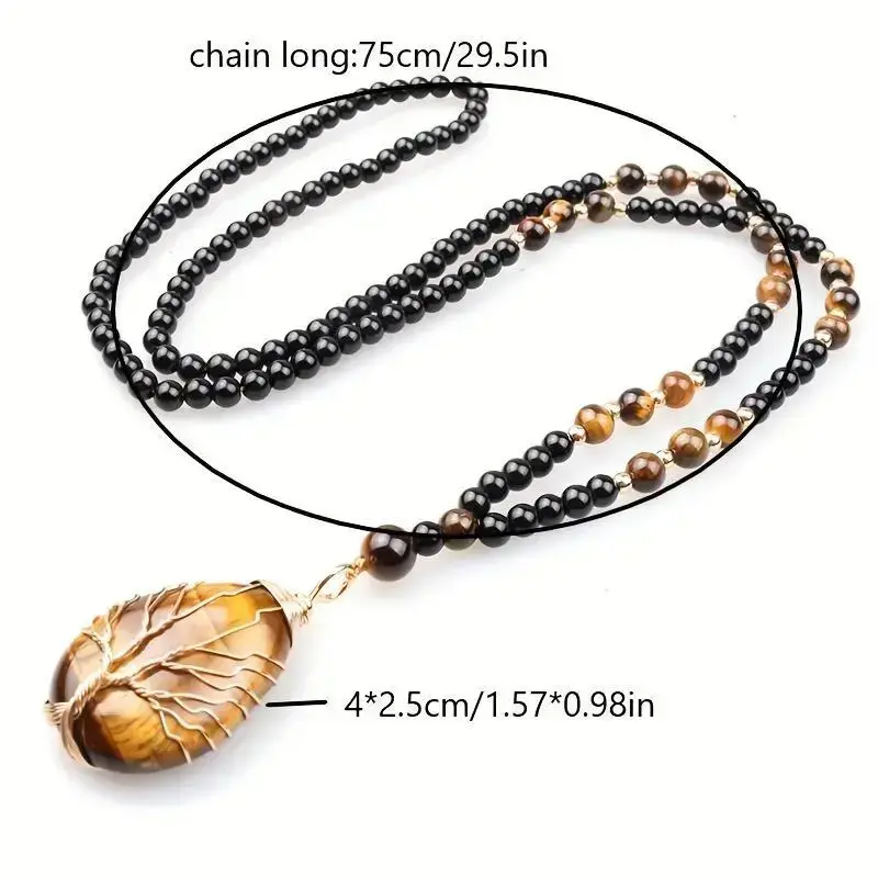 [Natural Tree of Life Pendant] Handcrafted Natural Tiger's Eye Stone Tree of Life Pendant Necklace - Bohemian Style Beaded Jewelry with Oval Amber Stone and Golden Accents, Black and Brownish-Orange Design for Men and Women colorf