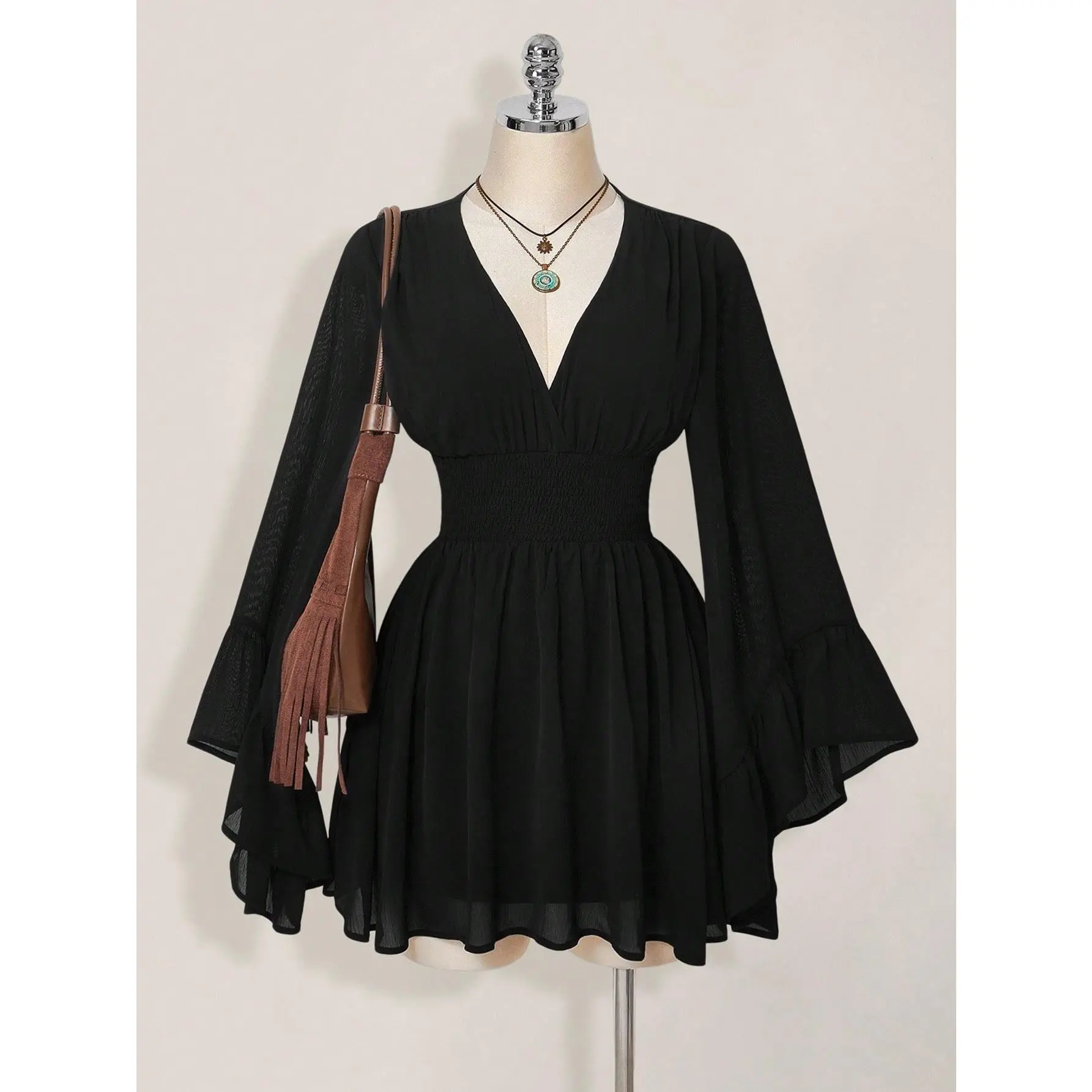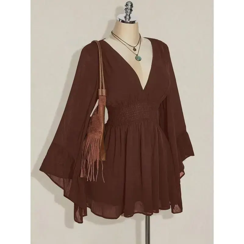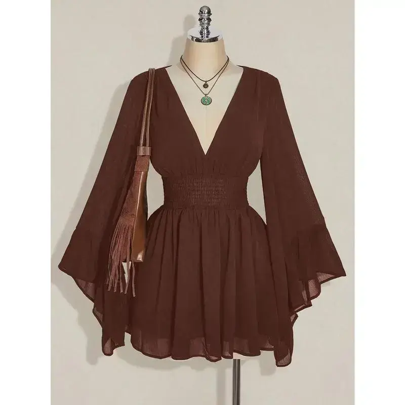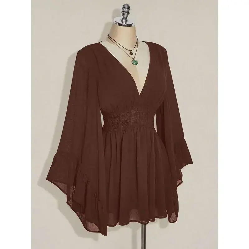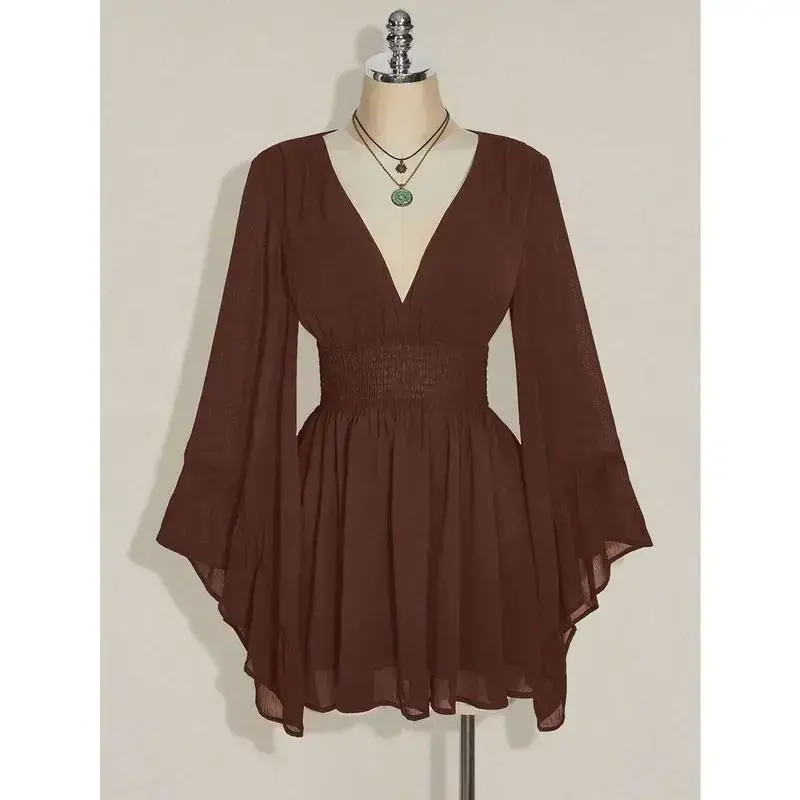 Neckline:Deep V Neck Sleeve Type:Flounce Sleeve Hem Shaped:Flared Waist Line:High Waist Type:A Line Details:Ruffle, Shirred Pattern Type:Plain Body:Lined Lined For Added Warmth:No Pockets:No Style:Casual Color:Brown Sleeve length: long sleeve Sheer:No Length:Mini Fit Type:Slim Fit Fabric Elasticity:Non-Stretch Material:Chiffon Composition:100% Polyester Care Instructions:Machine wash or professional dry clean Chest pad:No Padding Belt:No