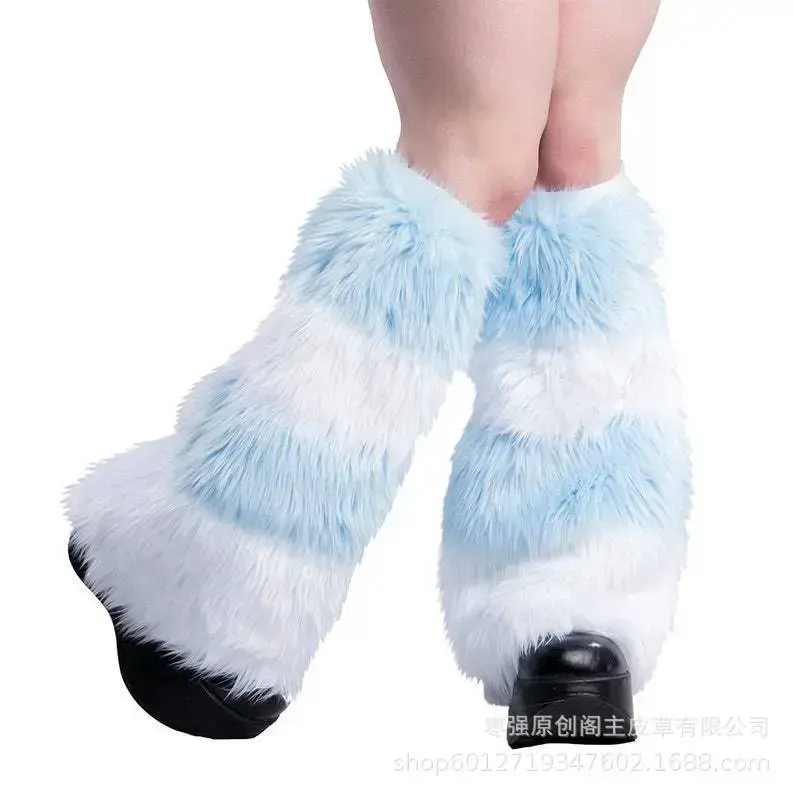 Women Faux Fur Leg Warmer for Boot Ladies Thick Fluffy Contrast Color Stripe Pattern Warmer Boot Cuff Stockings for Winter