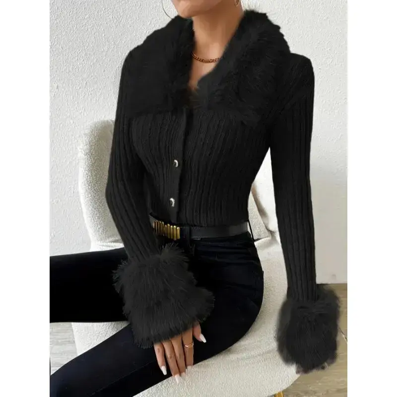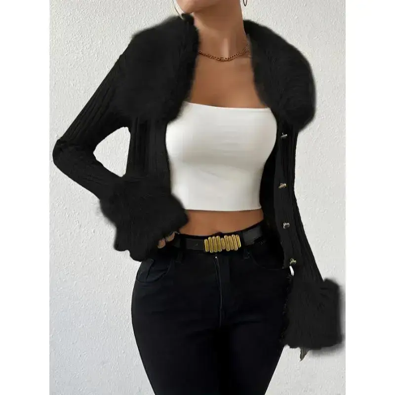 Elegant Faux Fur Collar Cardigan Sweater for Women HX375904 Sexy Solid Color Knit Polyester with Button Detail for Fall/Winter Collection Micro Elasticity Knitting Black Long Sleeve Knitwear