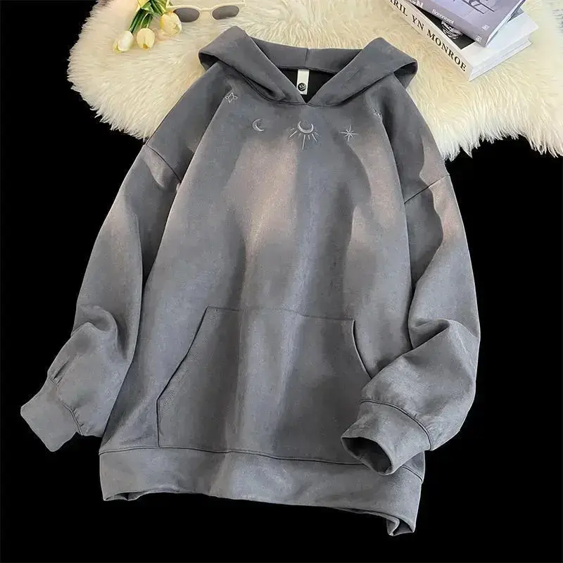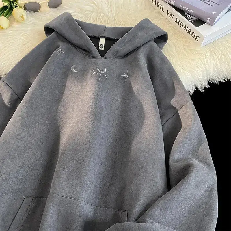 New Suede Sweatshirt Men Retro Street Loose Hoodie Embroidery Pattern Gothic Style Hooded Sweatshirt Autumn Male Sweatshirts Menswear Tops