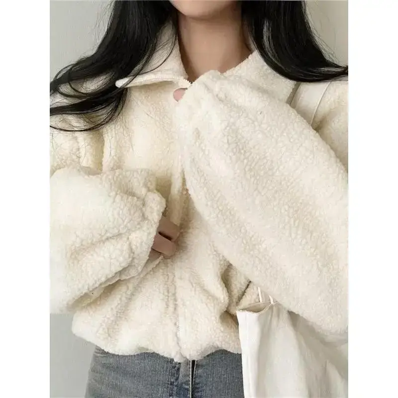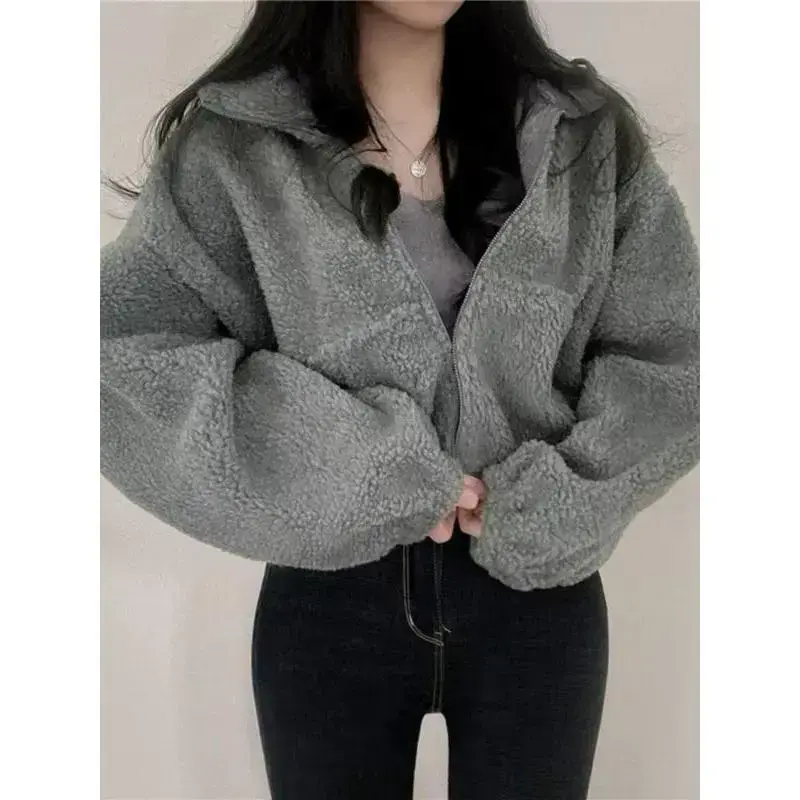 Warm Material : Crafted from plush lamb wool fabric, this outerwear provides exceptional warmth during winter seasons. Cropped Length : The short design of this hoodie offers a trendy silhouette, making it easy to pair with high-waisted bottoms. Long Sleeves : Equipped with full-length sleeves, this garment ensures full arm coverage while maintaining a relaxed feel. Waist Design : Featuring a cinched waist, this hoodie highlights your figure, adding an element of flair to any outfit. Plain Pattern : The simple solid color enhances versatility, allowing it to be effortlessly mixed and matched with various styles.