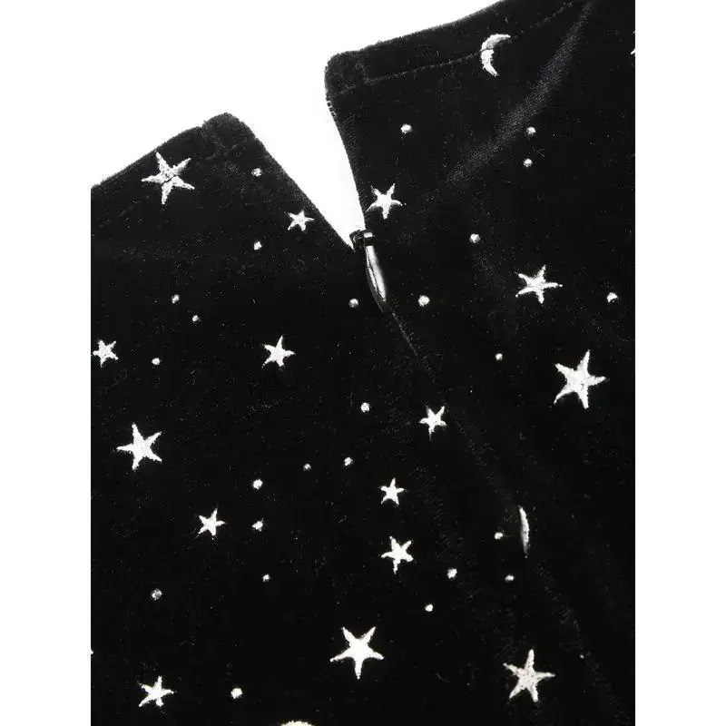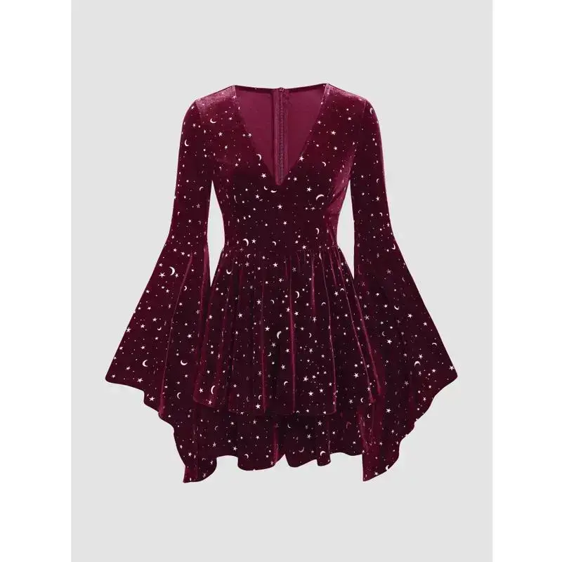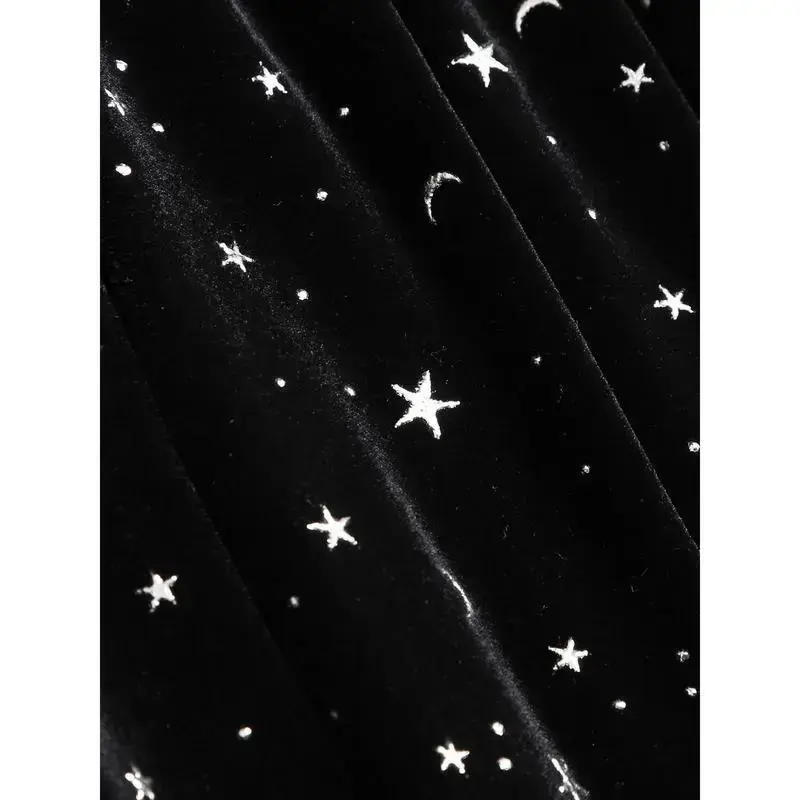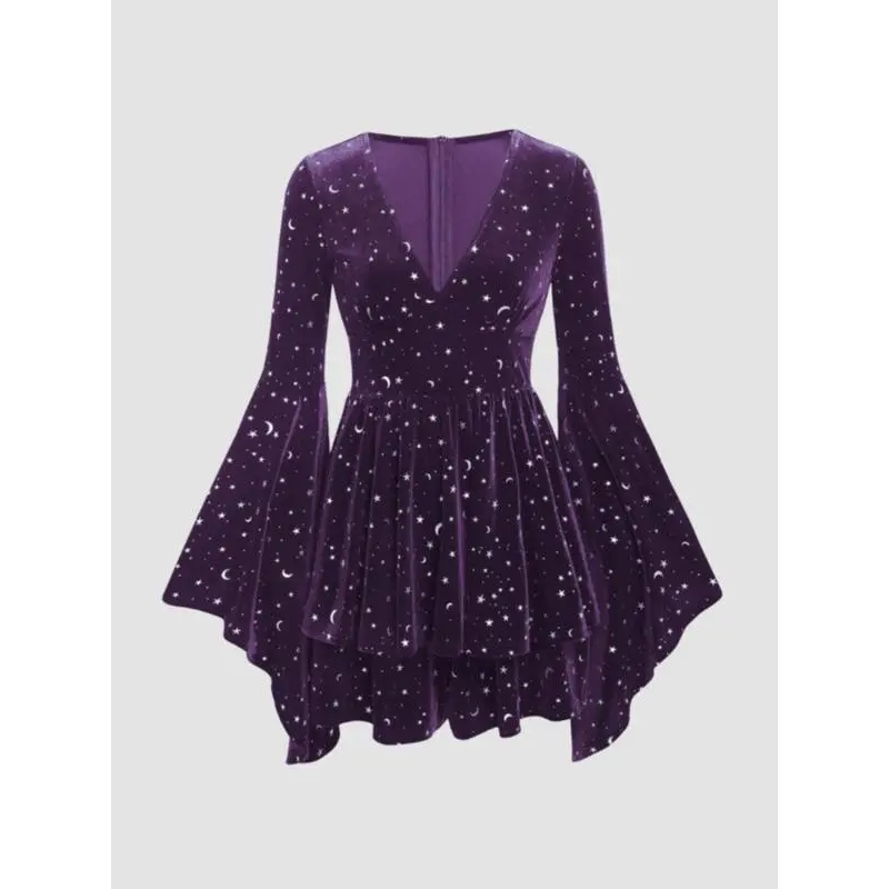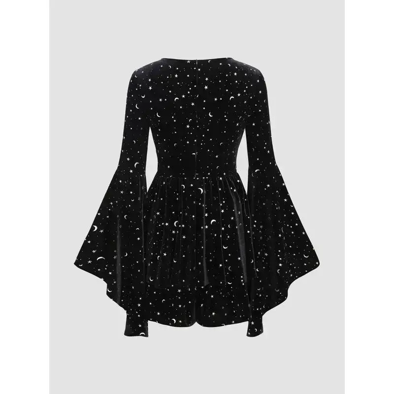 Velvet V-neck Star & Moon Pattern Bell Sleeve Wizard Romper