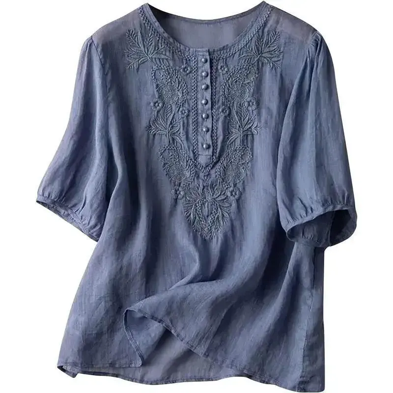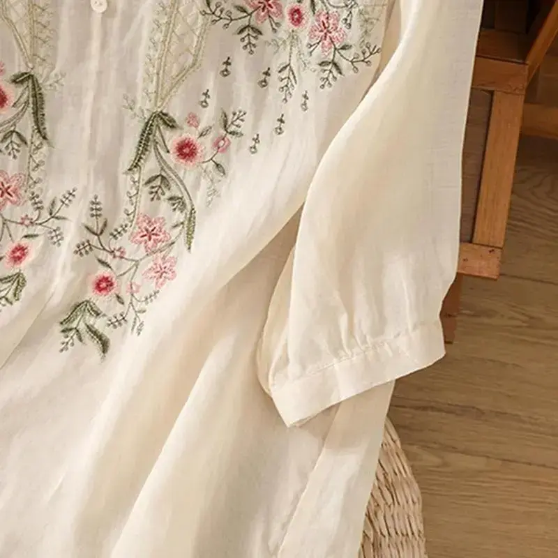 shirts women Floral Embroidered Tops Cotton Linen Shirts Boho Ethnic Style Peasant Tee Women 3/4 Sleeve V Neck Button Tunic Tshirt Blouses Womenswear