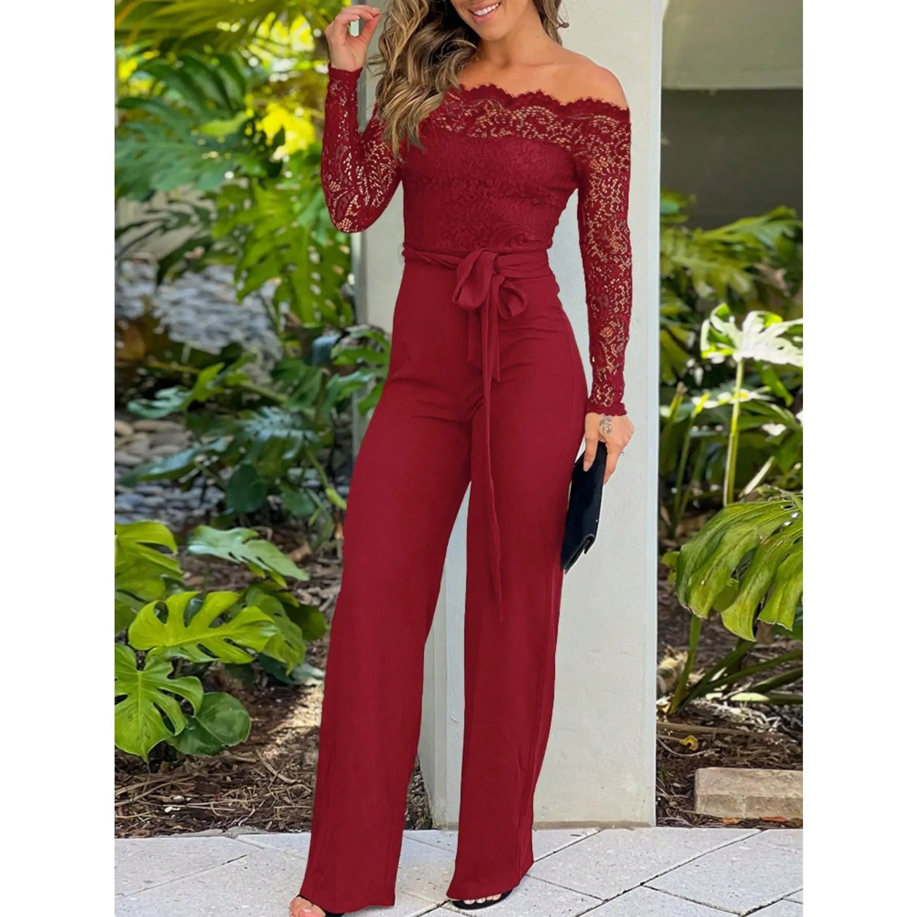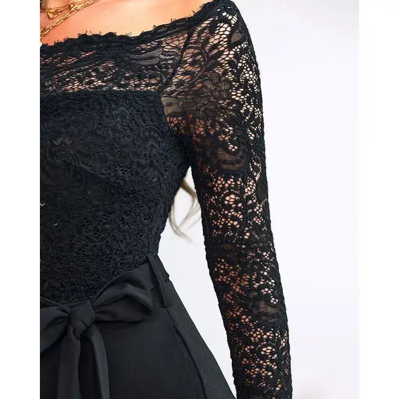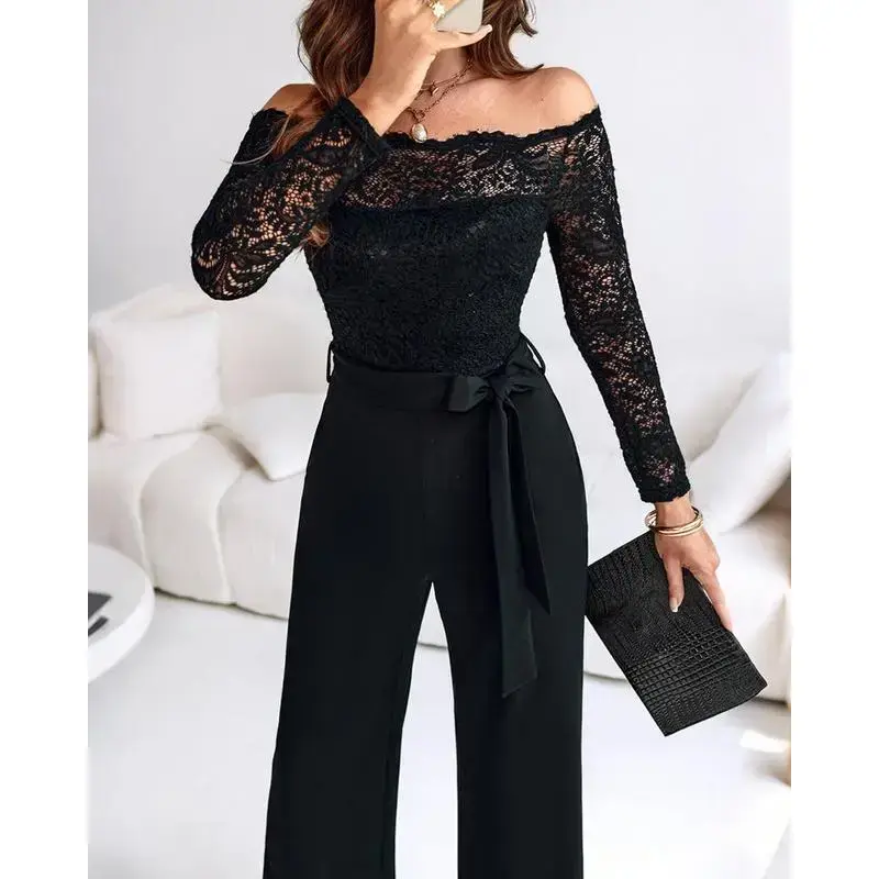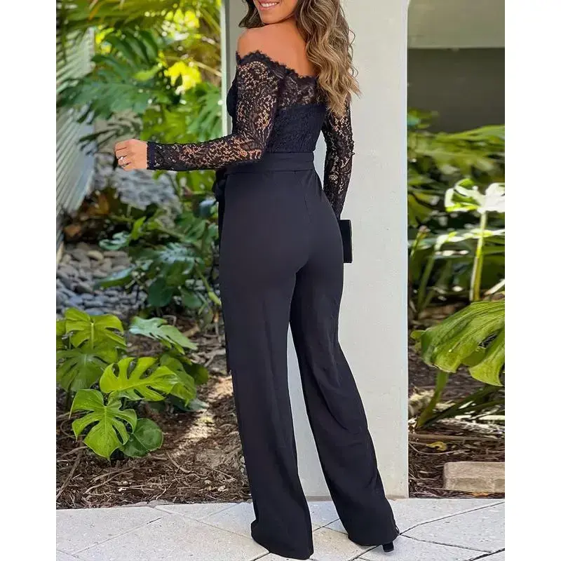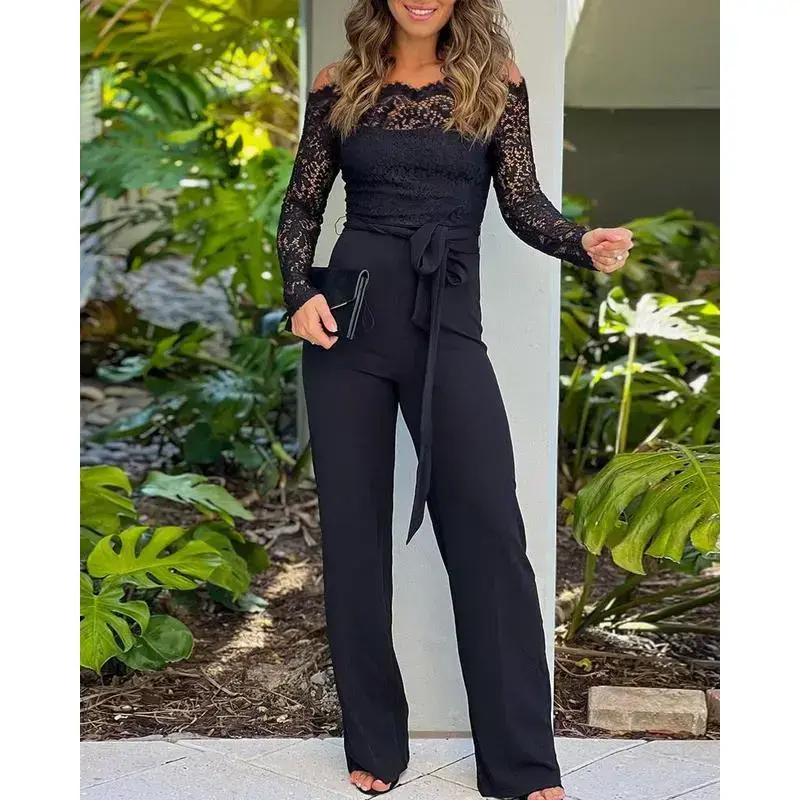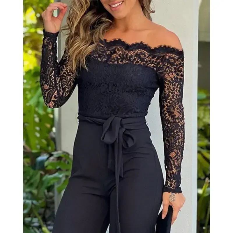 ChicMe Women's 2025 Off Shoulder Long Sleeve Eyelash Lace Patch Slim Fit Jumpsuit Tied Detail Casual Overalls Elegant Black Fitted Piece(Raincoats)