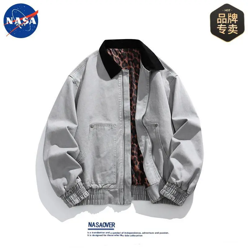 Men's Vintage Pure Cotton Jacket Collared Outerwear Leopard Print Detroit Denim Jacket Spring and Autumn Leather Bomber Jacket