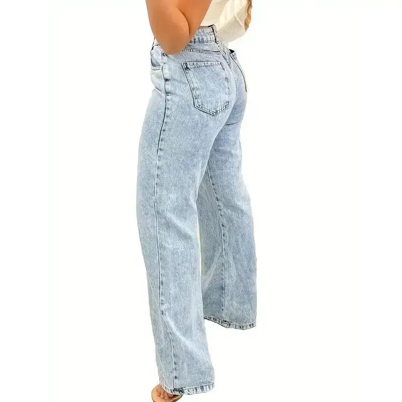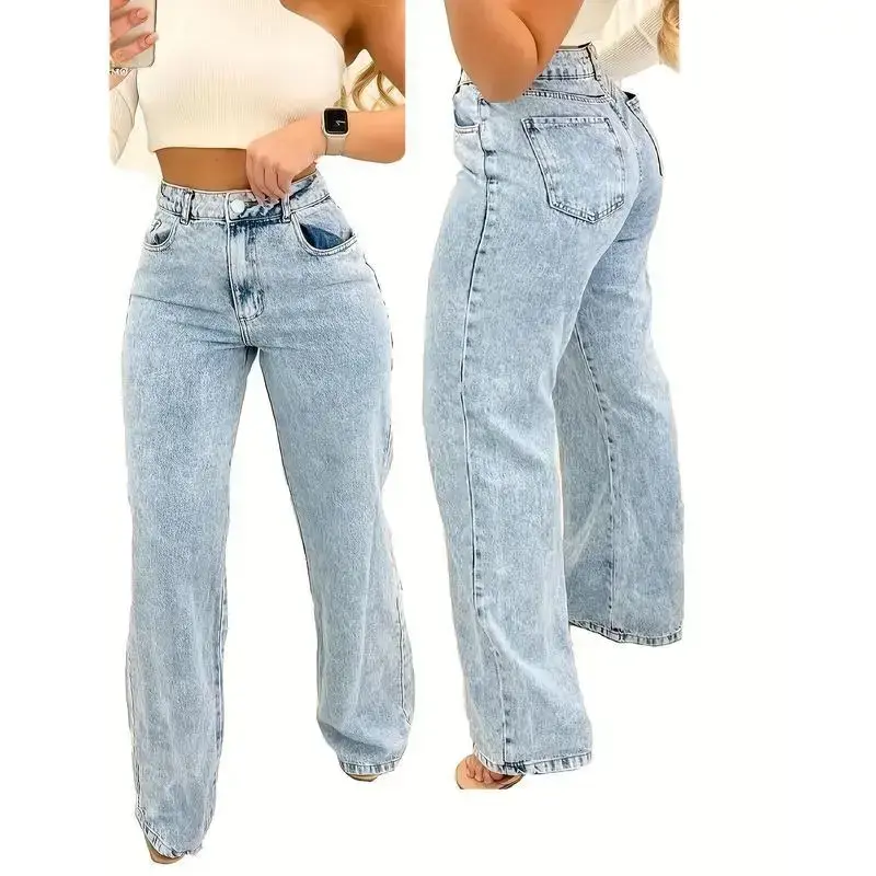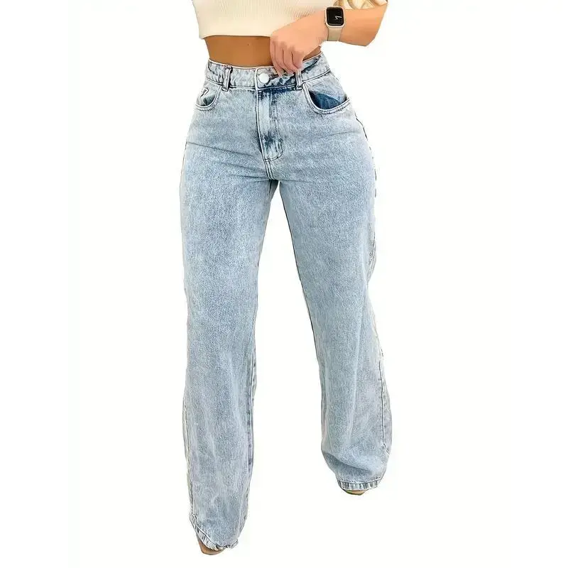 Women's Stretch Denim Straight-Leg Pants - Mid-Rise, Light Wash Blue, High Elasticity Rayon Blend, Comfort Fit with Pockets, Machine Washable, Versatile for All Seasons
