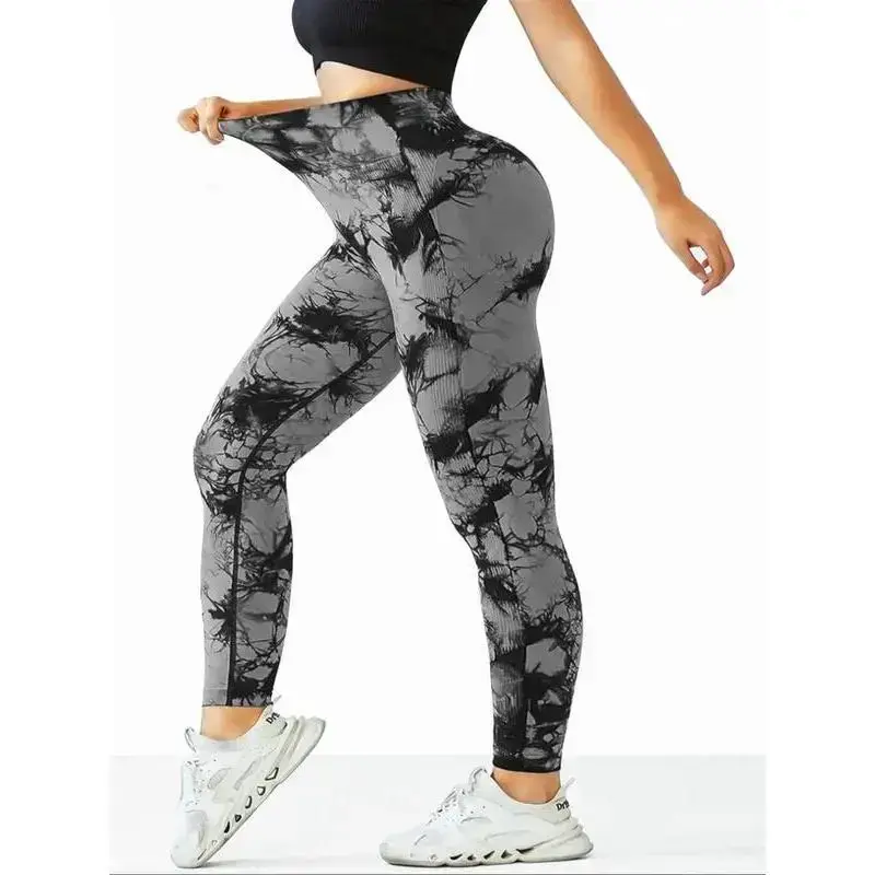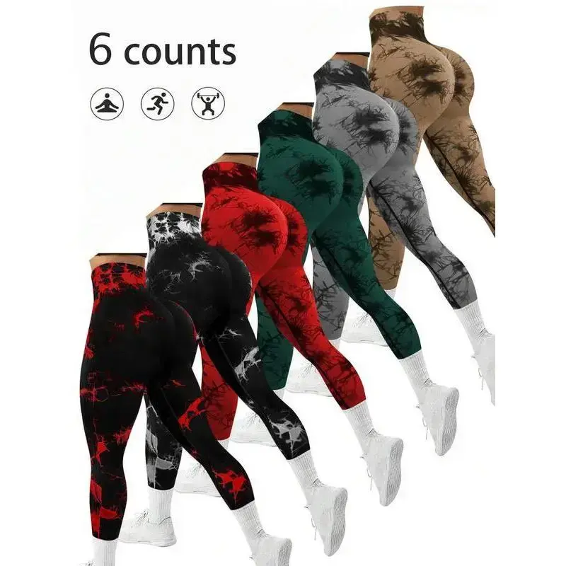6 pcs Women's Tie Dye Pattern Ruched High Waist Sports Leggings, Casual Sporty Comfy Breathable High Stretch Skinny Pants for Yoga Gym Workout Running, Ladies Sportswear for All Seasons, Tummy ControlGift