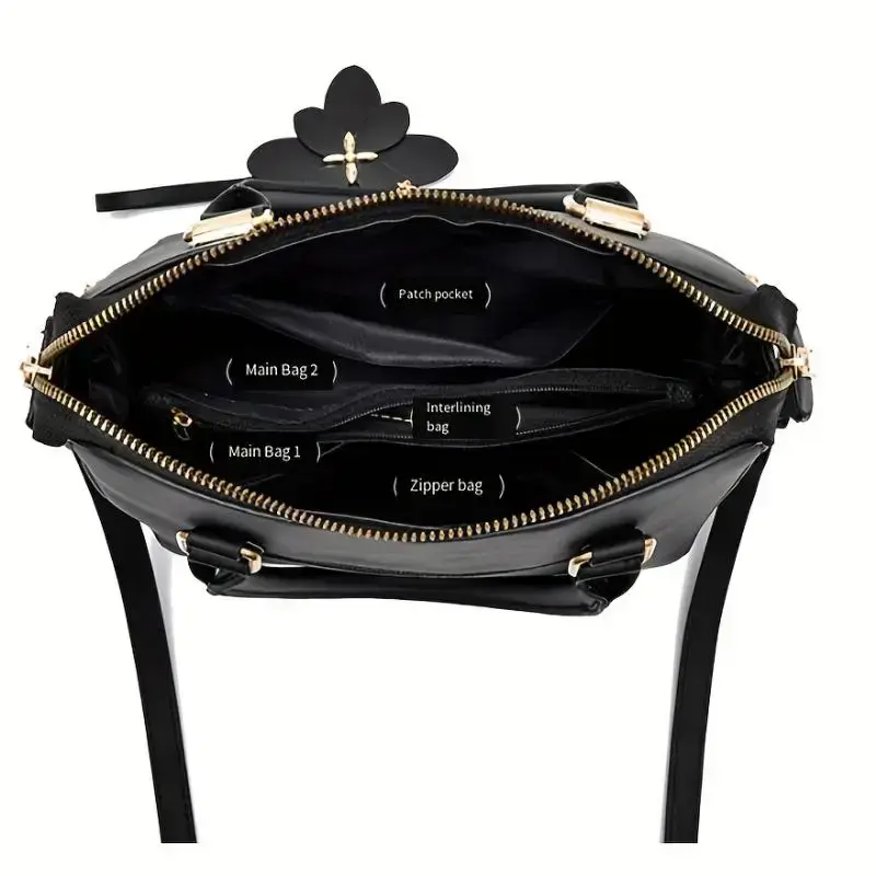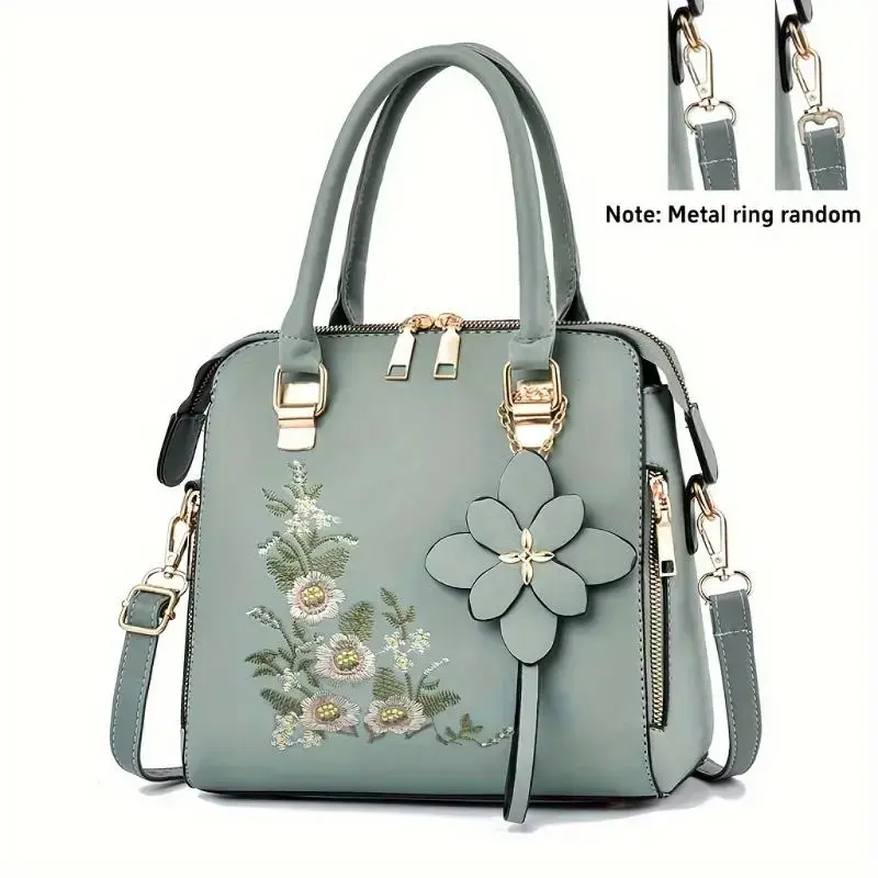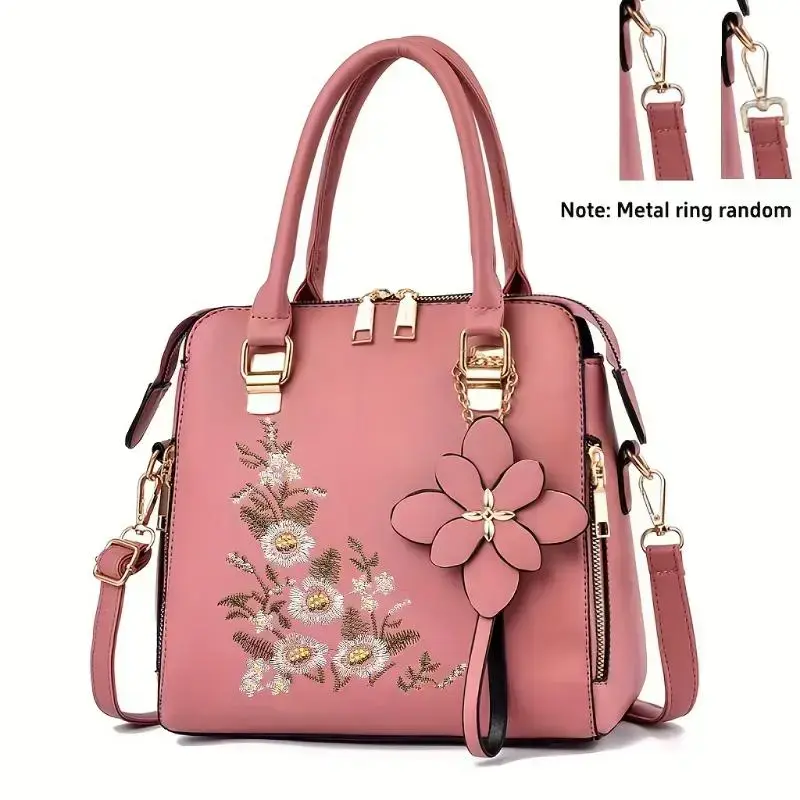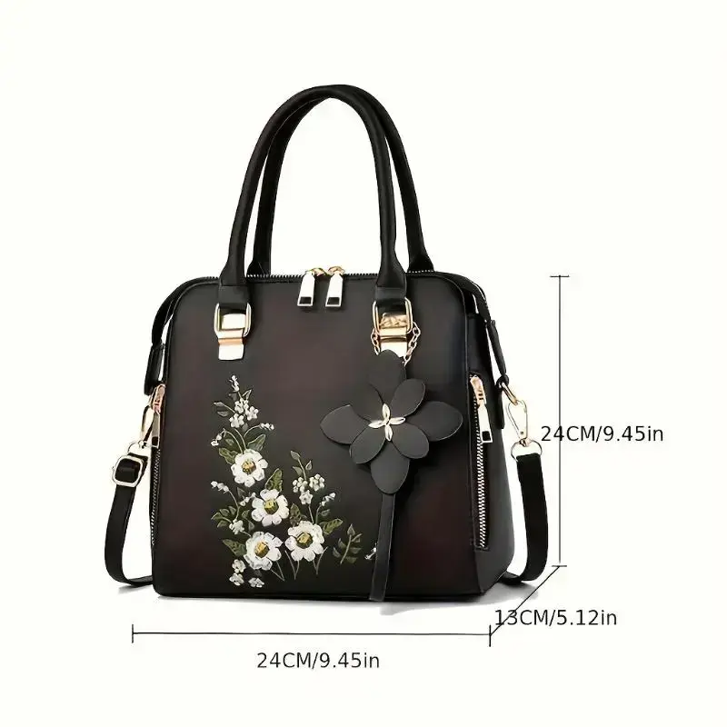 Stylish Embroidered Flower PU Leather Handbag - Top Handle Purses with Zipper Closure, Polyester Lining, Edge Paint, and Random Printing