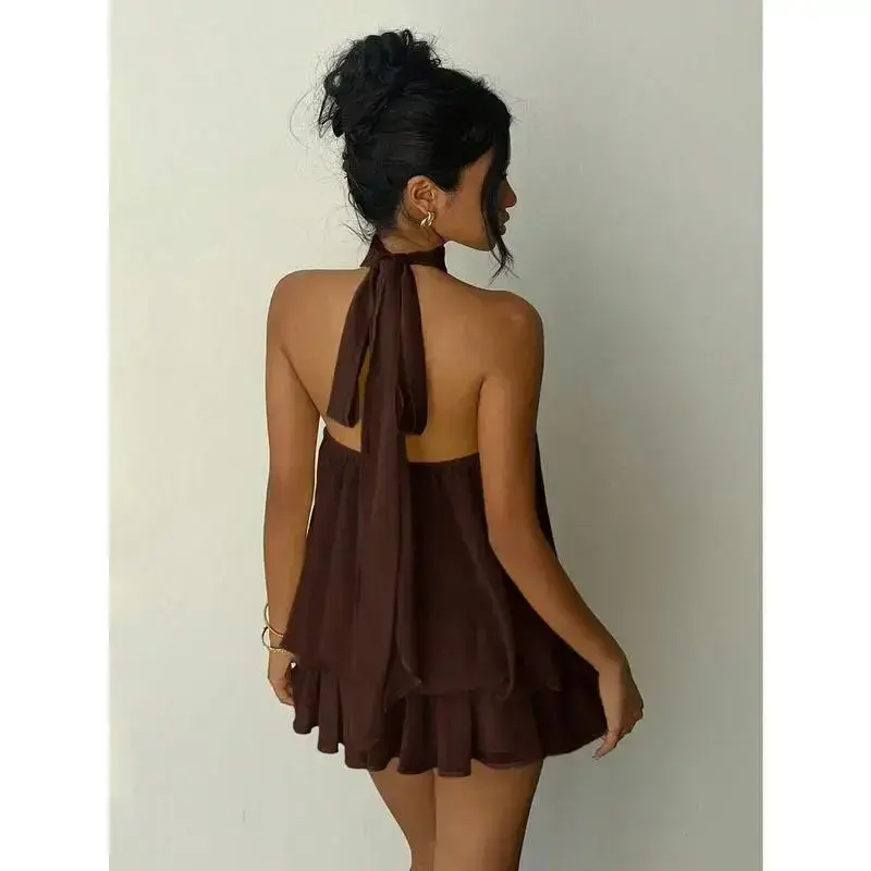 Women's Elegant Brown Halter Tie Mini Dress,Elegant Dresses For WomenGift(gift)