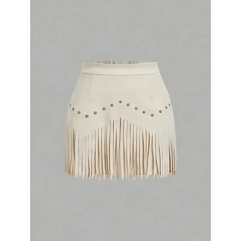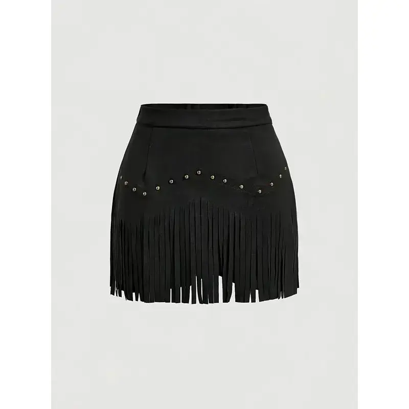 【Unique Features】: This dress features retro hippie styling with rivets and tassels, setting it apart from typical A-line skirts. 【Fabric Composition】: Made of woven imitation leather, offering a modern approach to classic fabric while maintaining durability. 【Seasonal Versatility】: Designed for all seasons, this skirt provides seasonal adaptability, making it suitable for any occasion throughout the year. 【Fitted Silhouette】: The fitted design enhances the body shape, providing a sleek and flattering silhouette that accentuates your figure. 【Short Length】: Showcasing a short skirt length that aims to stylishly highlight legs and add an upbeat vibe to your wardrobe.