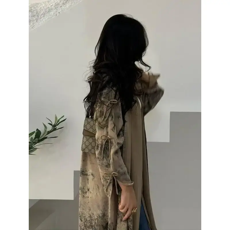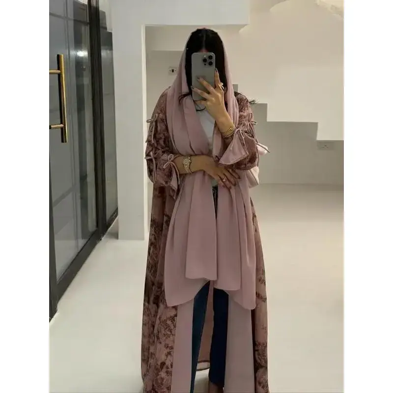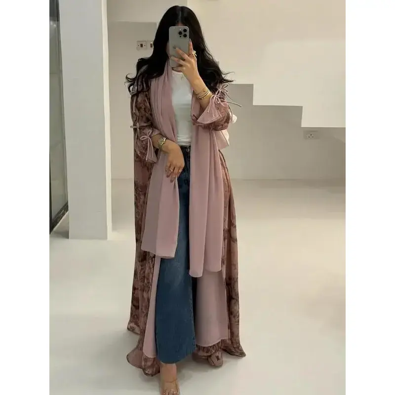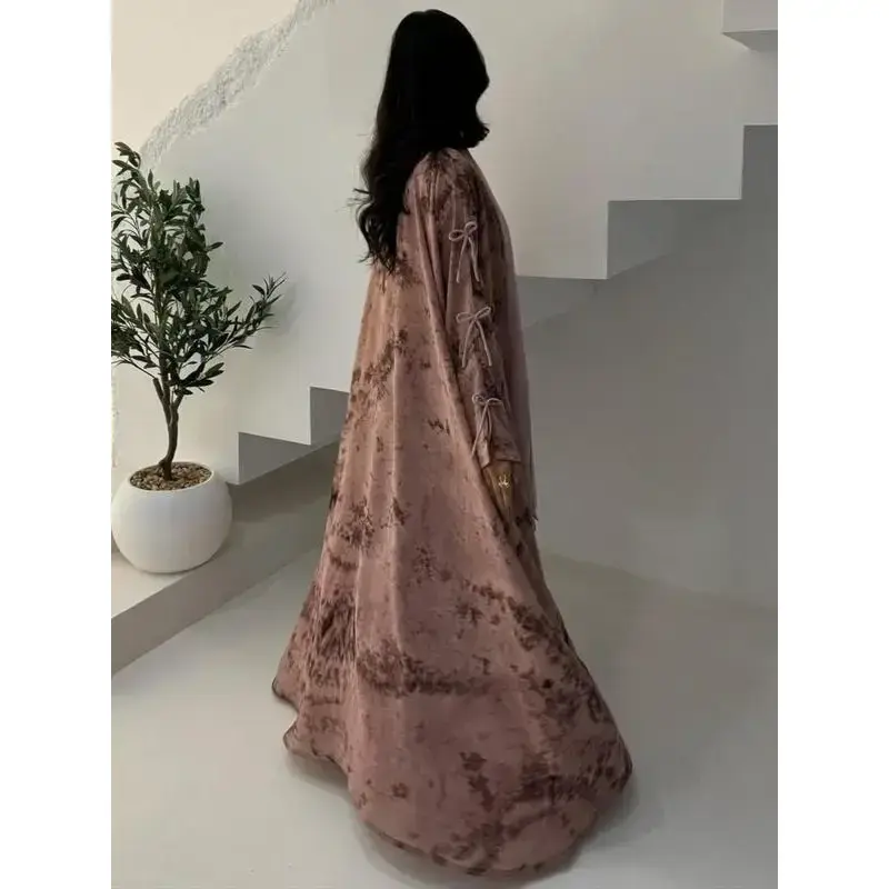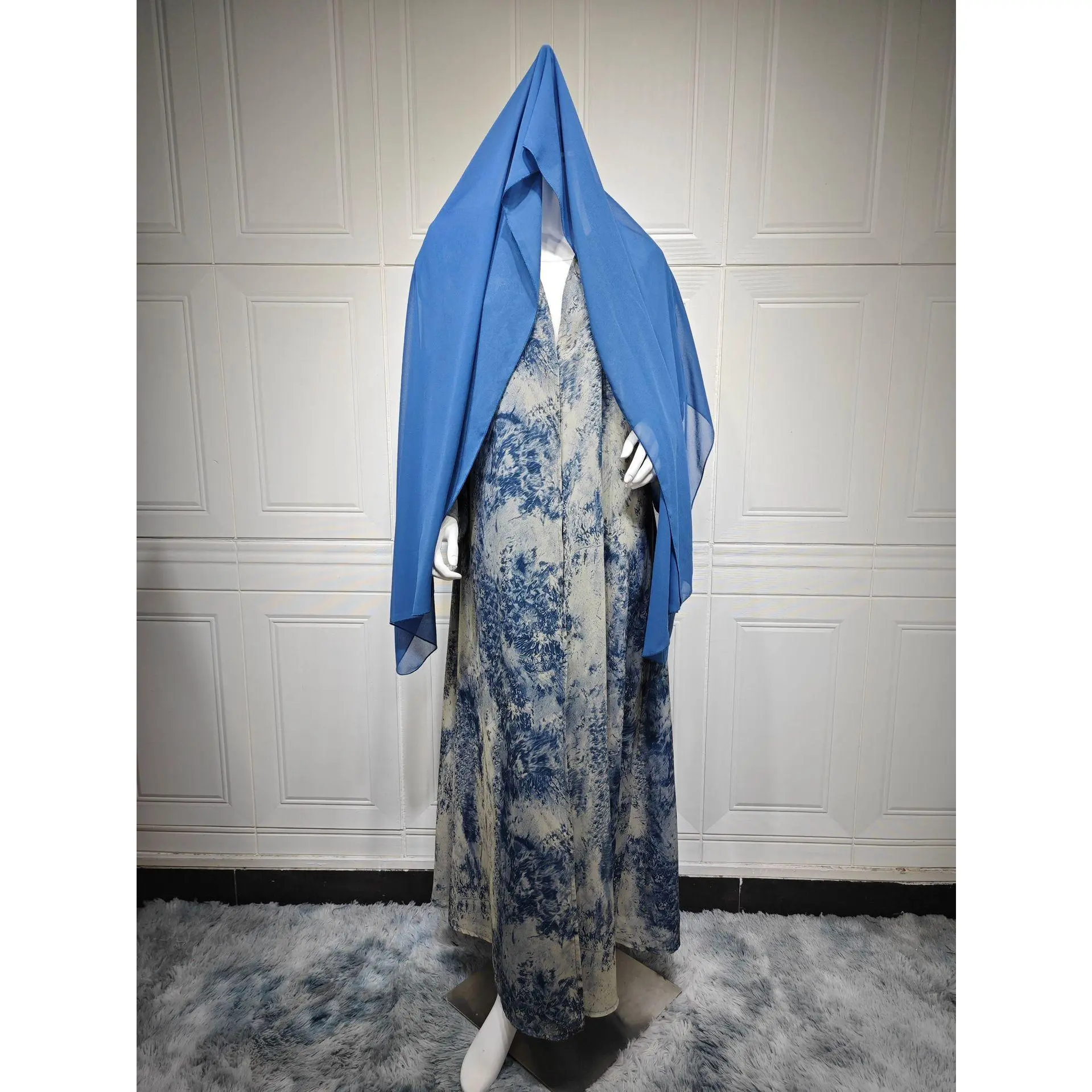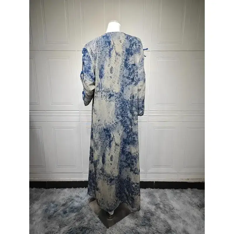 Elegant Women's Open Abaya with Tie Dye Print and Headscarf, Long Sleeve Casual Style for All Seasons, Muslim Fashion, Abaya Hijab Set