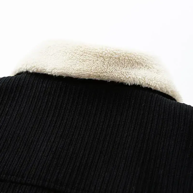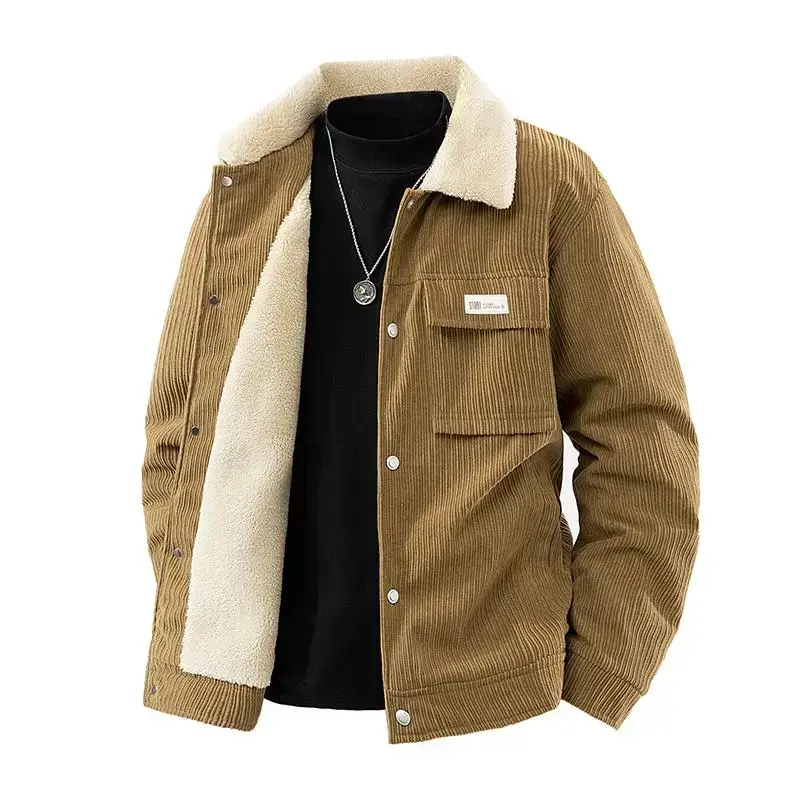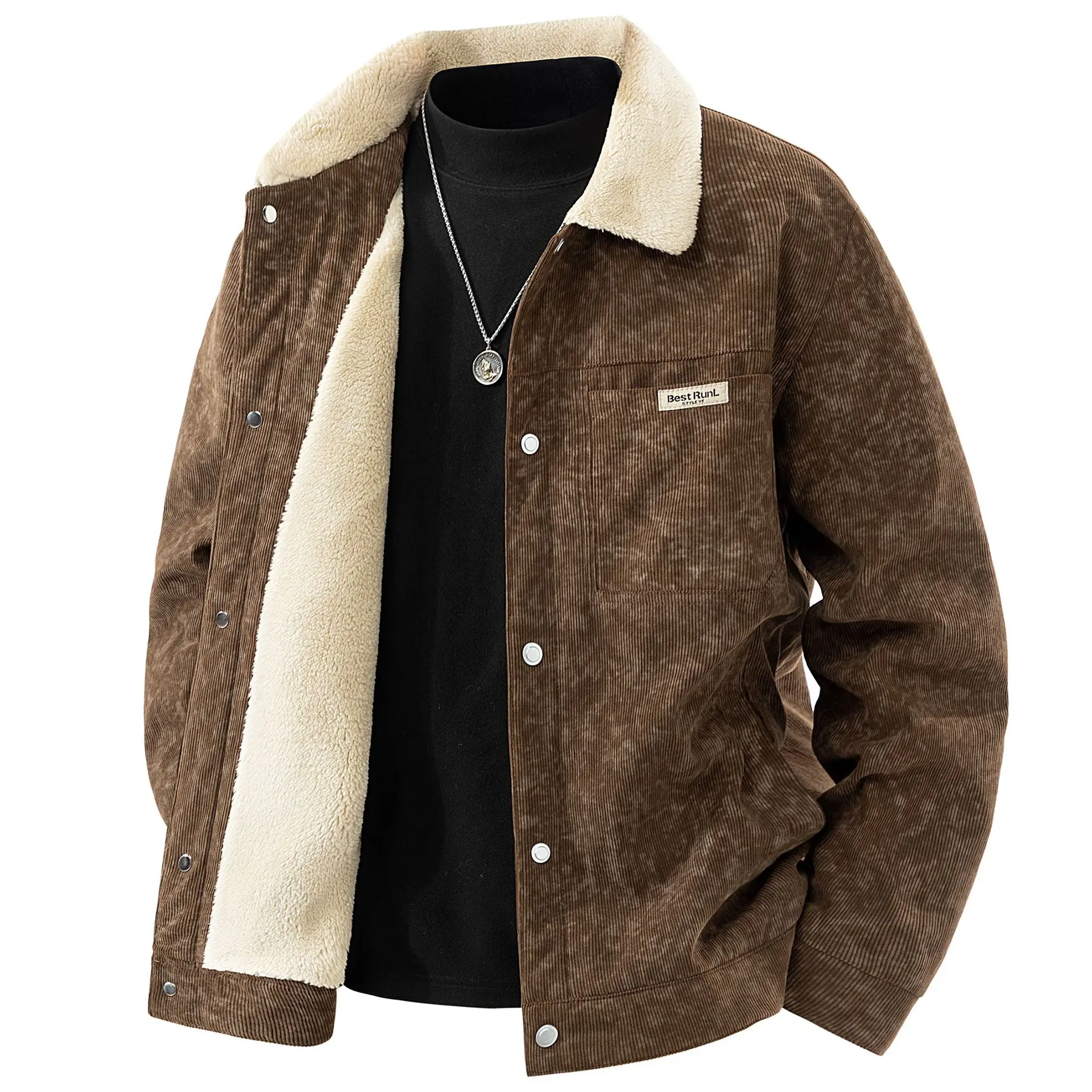 Autumn and winter men's wool-lined warm large size retro corduroy work jacket with large pockets and casual lapel design. Collar Men's Long Sleeve Jacket Polyester Fabric Brown Coat