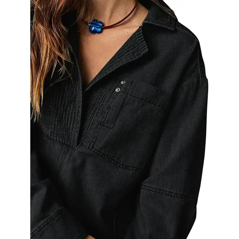 Womenswear Denim Pullover Casual Comfort Button V Neck Blouse Loose Fit Tops Longsleeves Jean Jacket With Pocket