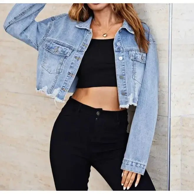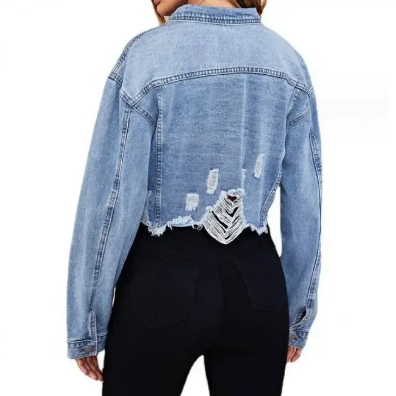Women'sDenimJacket2025AutumnFashionRippedPocketDesignCasualTurn-DownCollarLongSleevesDailyCropDenimJacketCoat