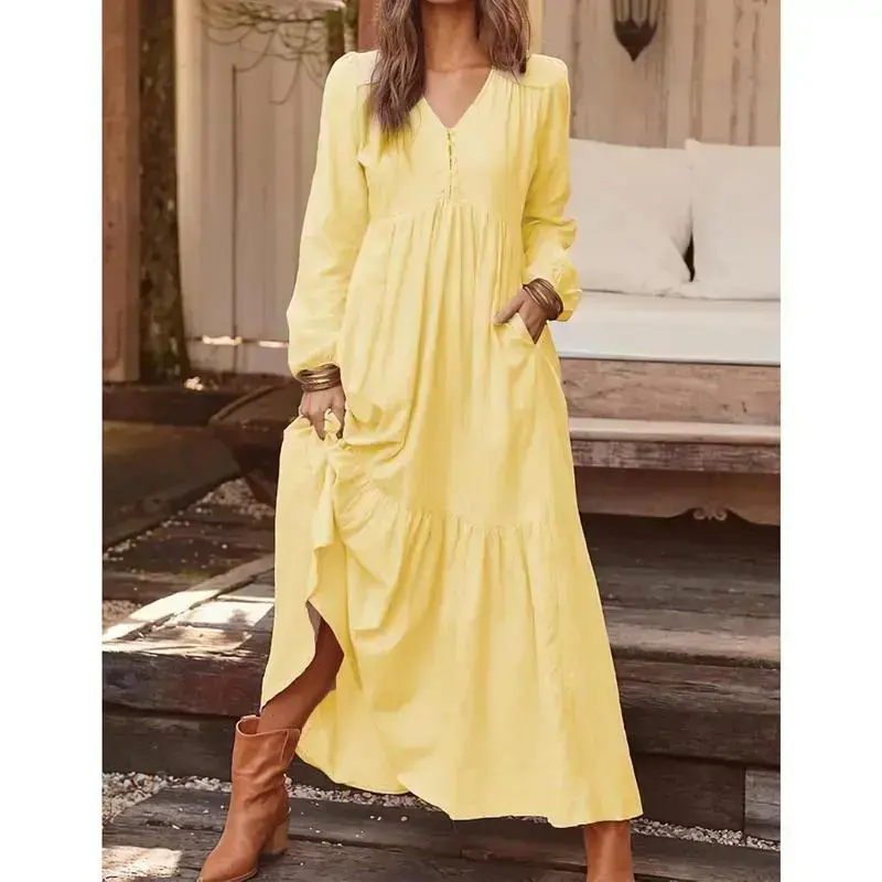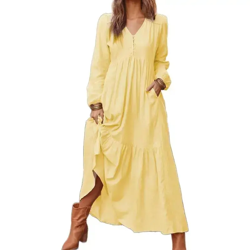 Women's Linen Maxi Dress Long Sleeve with Pockets Casual V-Neck Tiered Ruffle Dress Boho Beach Pleated Long Dress