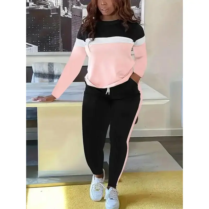 Women's Colorblock Striped Print Sweatshirt & Drawstring Waist Pants Two-Piece Set, Casual Long Sleeve Round Neck Top & Side Stripe Trousers 2 Piece Set for Summer, Women's Clothes for Daily Wear