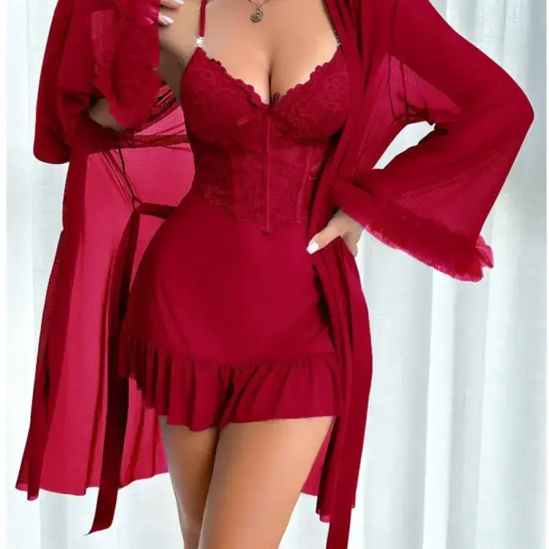 2-piece set: Fishbone lace nightgown and beautiful elegant wide-sleeved mesh robe for women's daily use