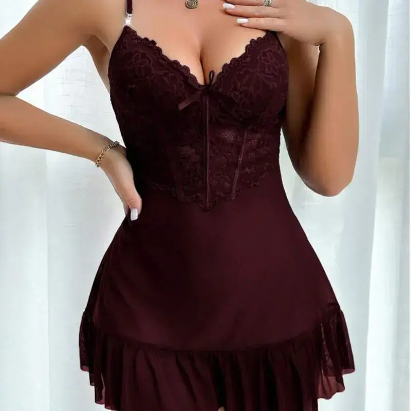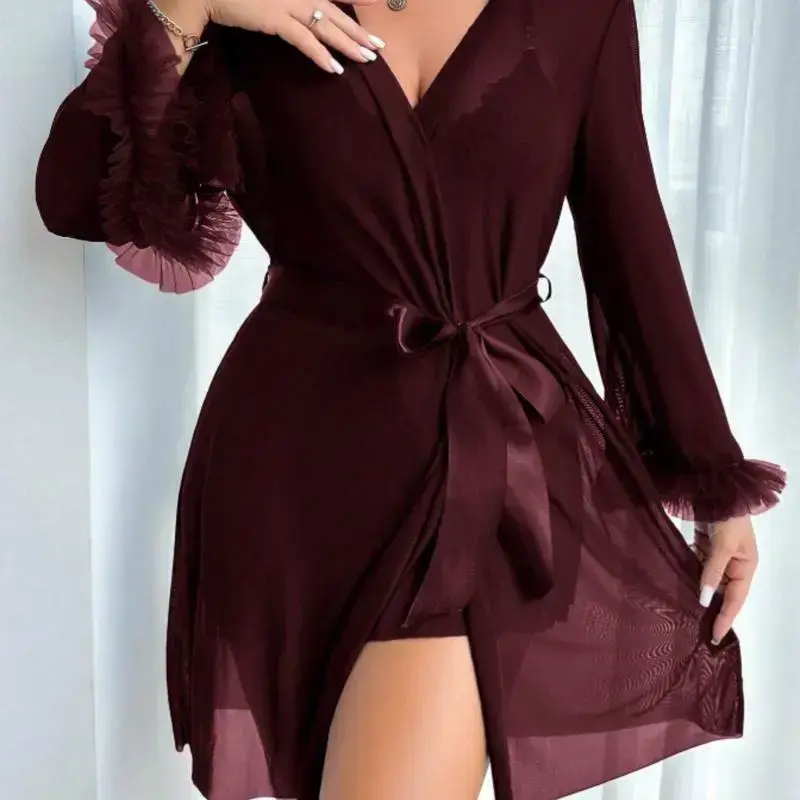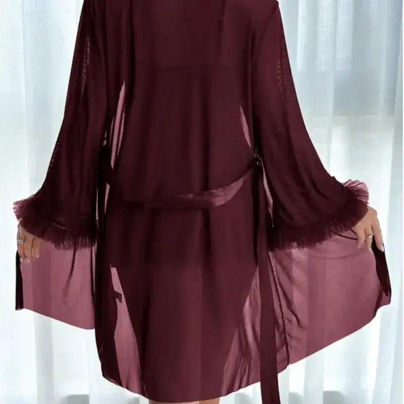 2-piece set: Fishbone lace nightgown and beautiful elegant wide-sleeved mesh robe for women's daily use Details: Bow, Contrast Lace, Sheer Style: Sexy Color: Maroon Pattern Type: Plain Type: Dress Sets Neckline: Spaghetti Strap Dresses Sleeve Length: Sleeveless Outerwear Sleeve Length: Long Sleeve Sleeve Type: Flare Sleeve Dresses Length: Mini Outerwear Length: Thigh Length Fit Type: Regular Fit Waist Line: High Waist Sheer: Semi-Sheer Number of Pieces: 2 Piece Set Fabric: Medium Stretch Care Instructions: Hand wash or professional dry clean Belt: Yes Dresses & Outerwear Material: Mesh Fabric Dresses & Outerwear Composition: 95% Polyester, 5% Elastane Size: 75 cm