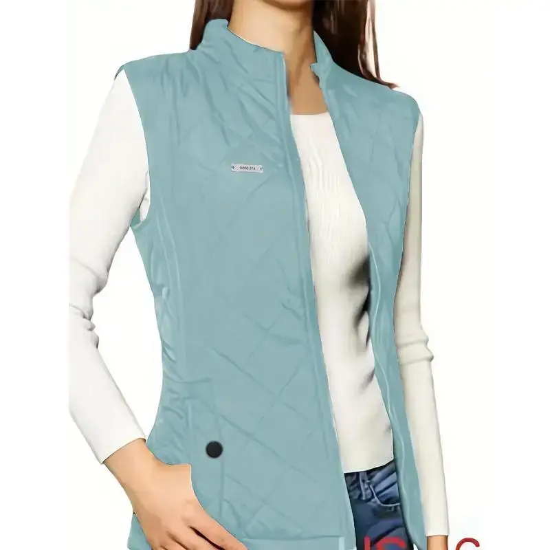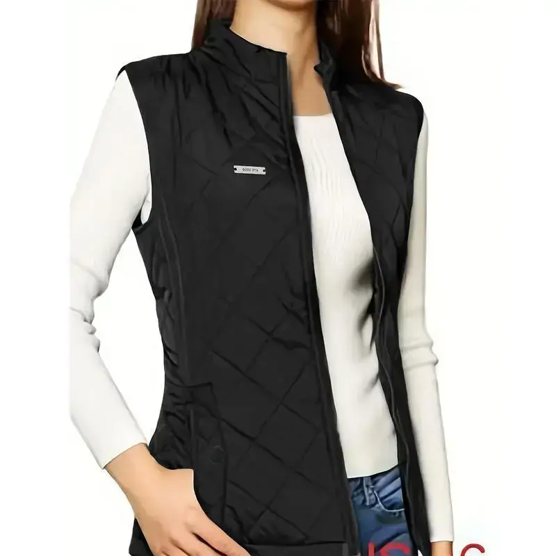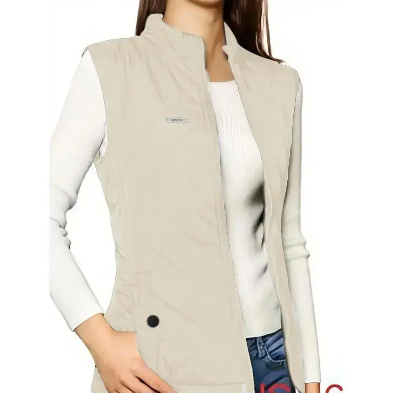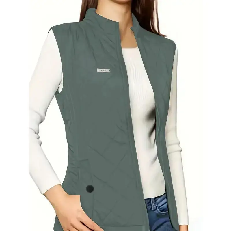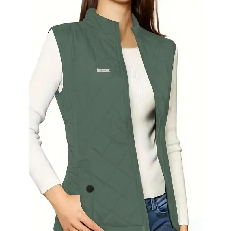 Zip-up Quilted Puffy Lapel Vest, Casual Sleeveless Pockets Patch Vest For Fall & Winter, Women's Clothing