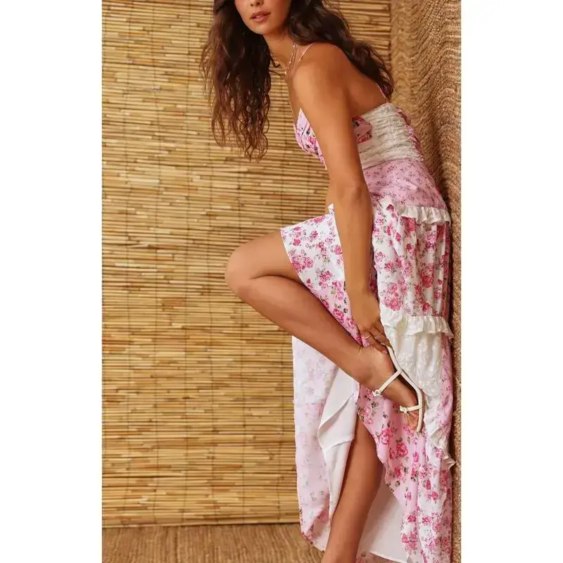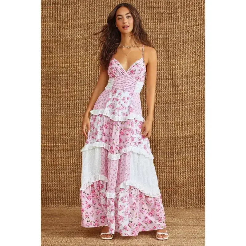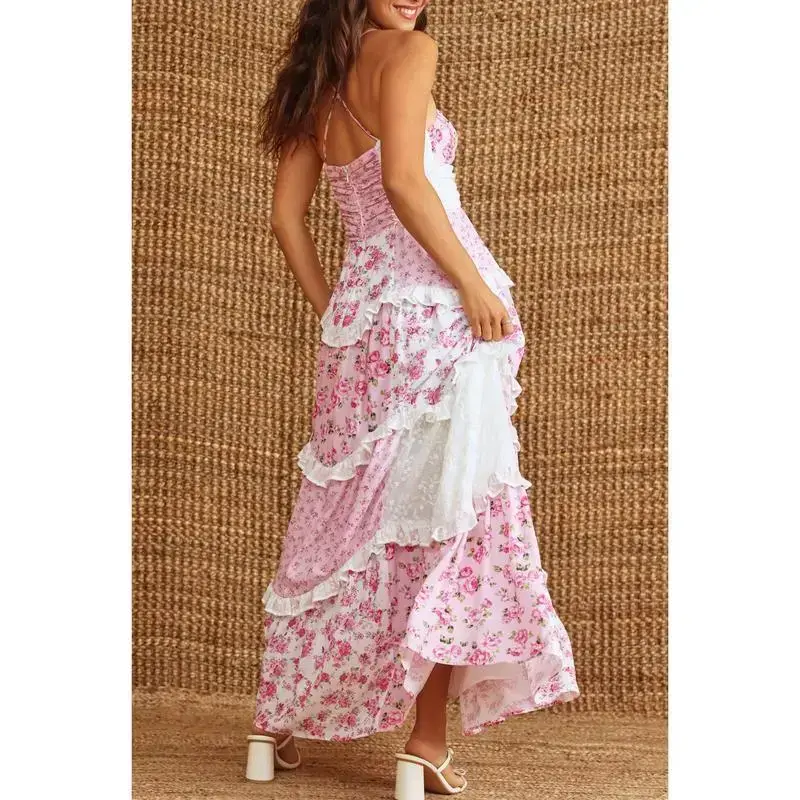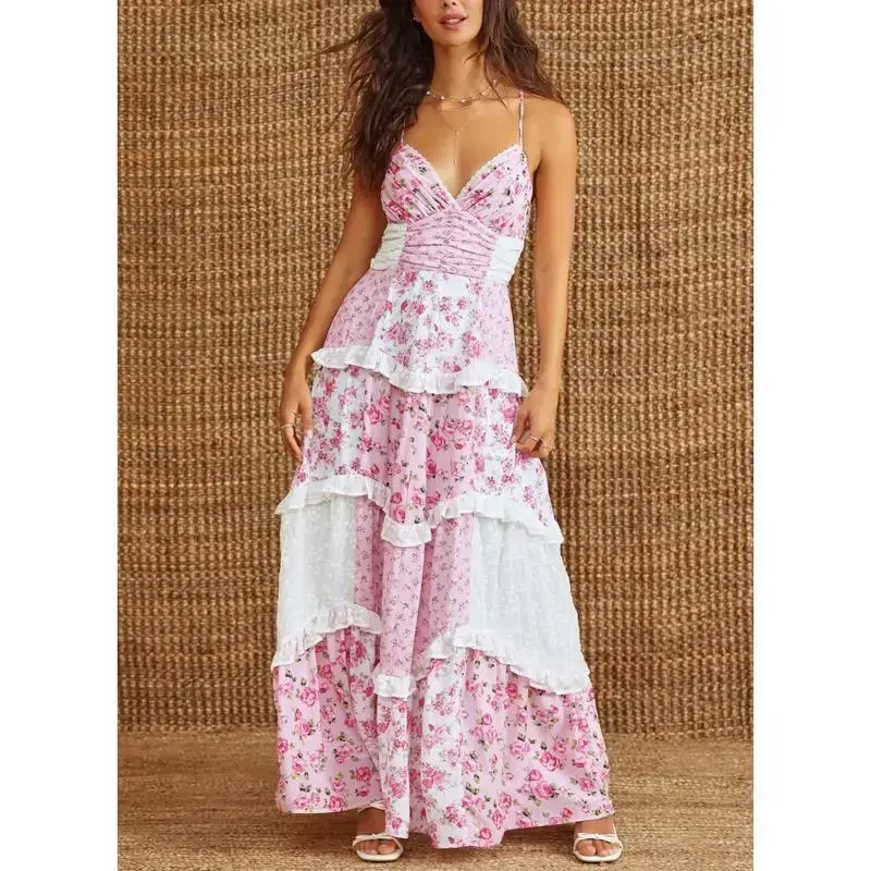 Women's Floral Dress Stylish Lace Patchwork Ruffled Trim Sleeveless Spaghetti Strap V Neck A-Line Long Dress for Summer