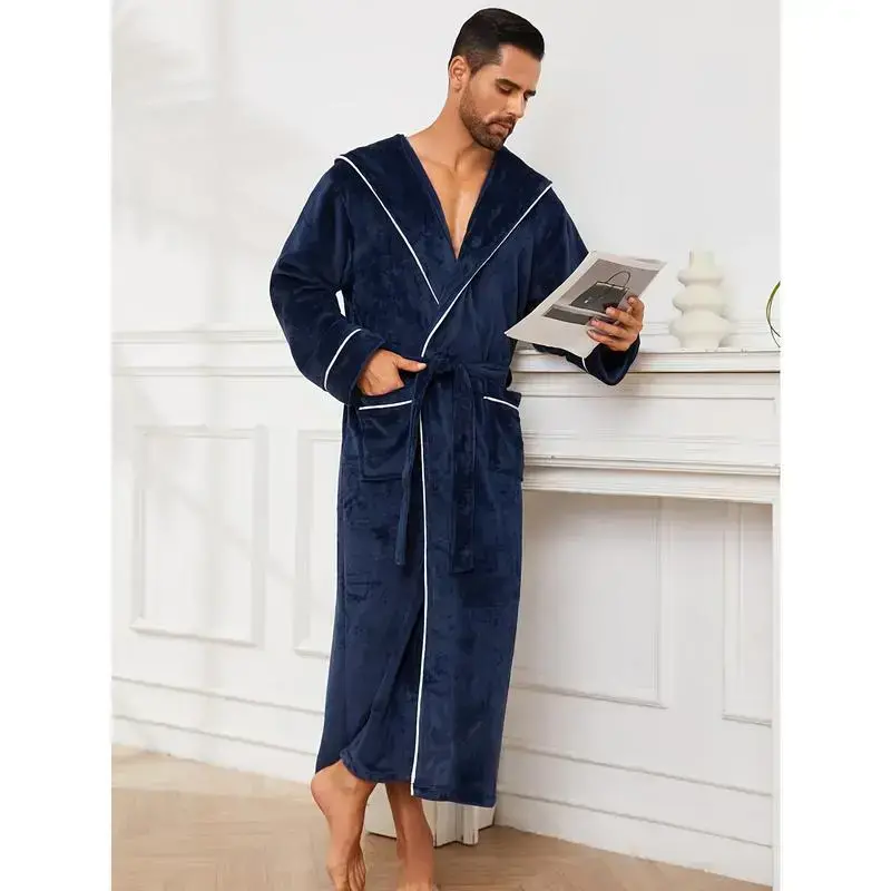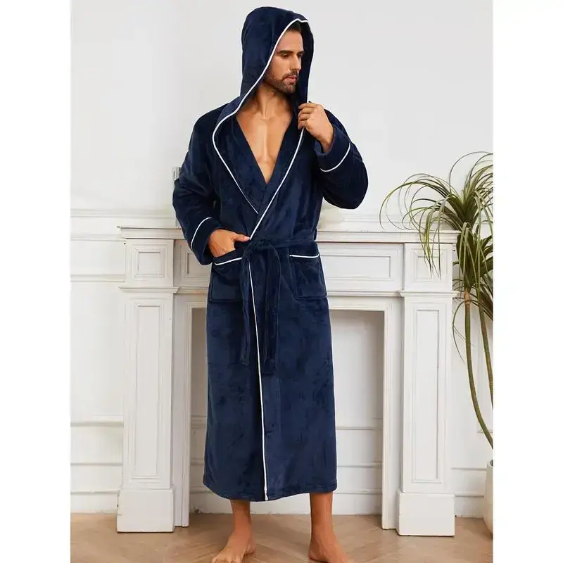1pc Luxurious Plush Fleece Bathrobe - Cozy Thick Double-Layer Hooded Lounge Wear with Pockets, Machine Washable, Ideal for Autumn/Winter Comfort Long Sleeve Fashion Men's Cotton Flannel Robe