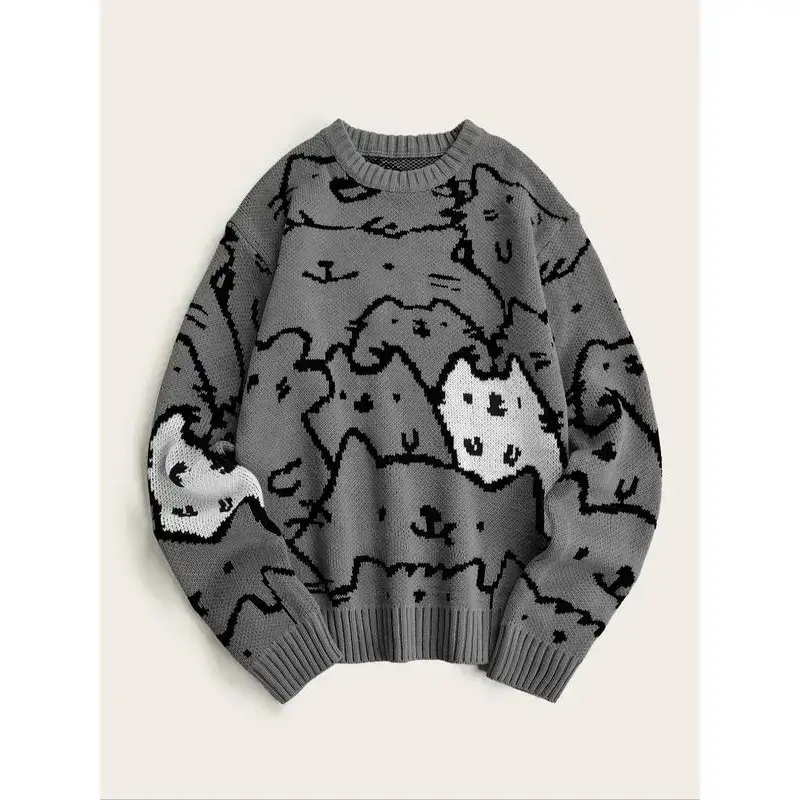 Men's Cartoon Cat Print Drop Shoulder Sweater, Fashion?Casual Soft Comfy Regular Fit?Long Sleeve Round Neck Jumper For Summer, Men's Knitwear For Daily Wear