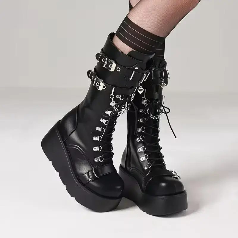 DATA MEASUREMENT: This goth platform boots has a 3.15" wedge heel. CLASSIC DESIGN: These knee high combat boots are designed with classic chain, a round toe, a wedge heel, a lace up, and a rubber sole. They are comfortable and wearable. EASY ON/OFF: The knee high wedge boots have a lace-up closure that makes them easy to get on and off. These shoes are the most stylish items of all time.