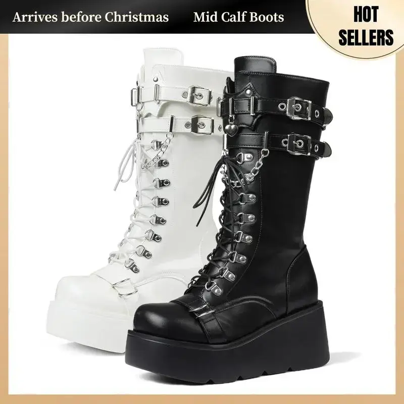 Women Gothic Knee High Boots Wedge Platform Mid Calf Round Toe Side Zip Boots Lace Up Punk Style Boots Comfortable Tall Punk Combat Boots