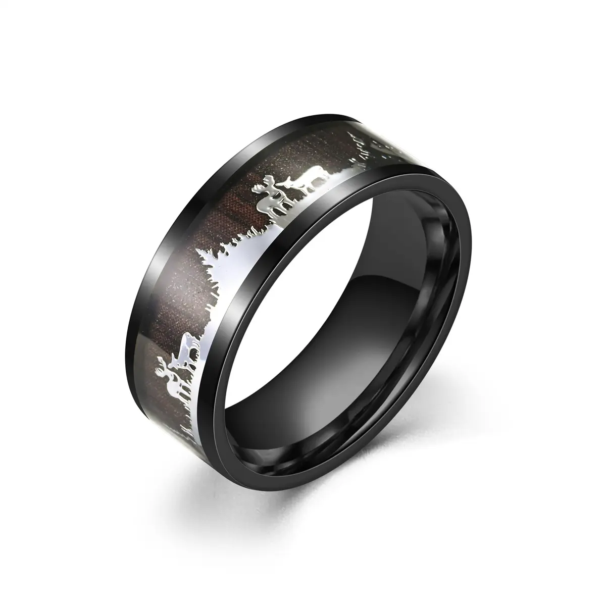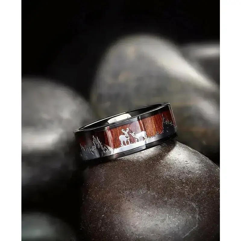 Men's Black Tungsten Hunting Ring Wedding Band Wood Deer Nature 8MM