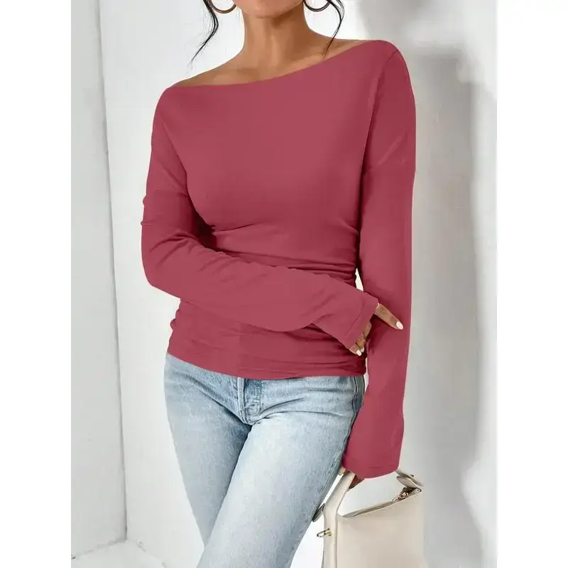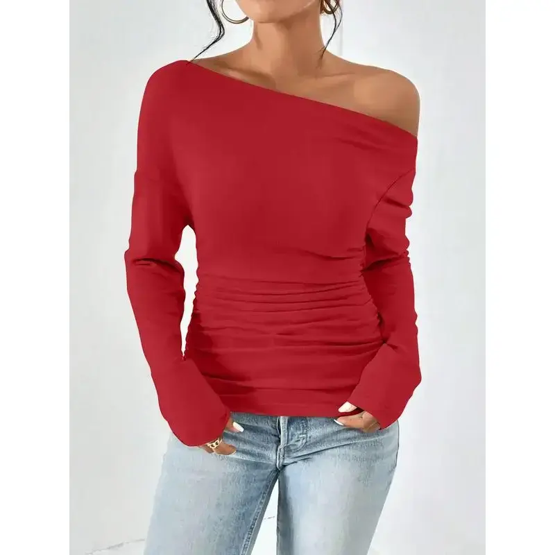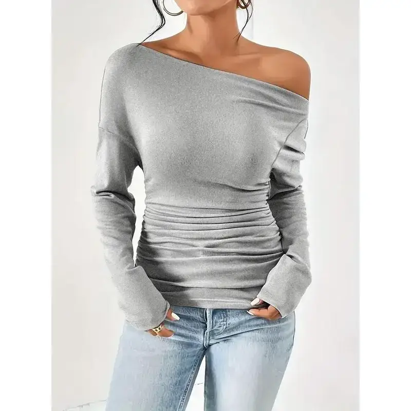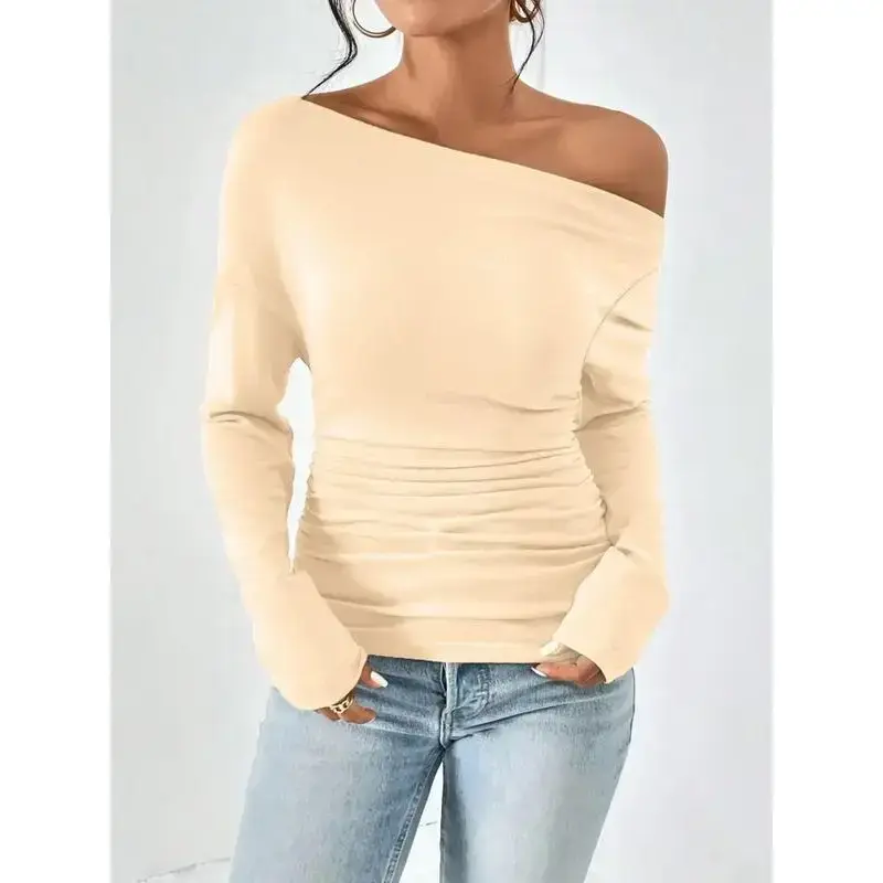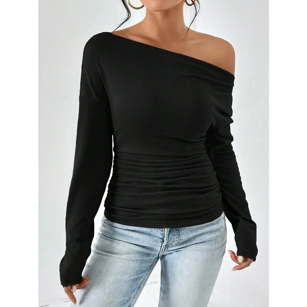 Women's Plain Minimalist Basic Ruched Asymmetrical Neck Drop Shoulder Tee, Elegance Mufti Clothes, Fall Long Sleeve T-shirt for Everyday, Back To School T Shirts, Lady Clothes for Streetwear, Womenswear, Casual Wear