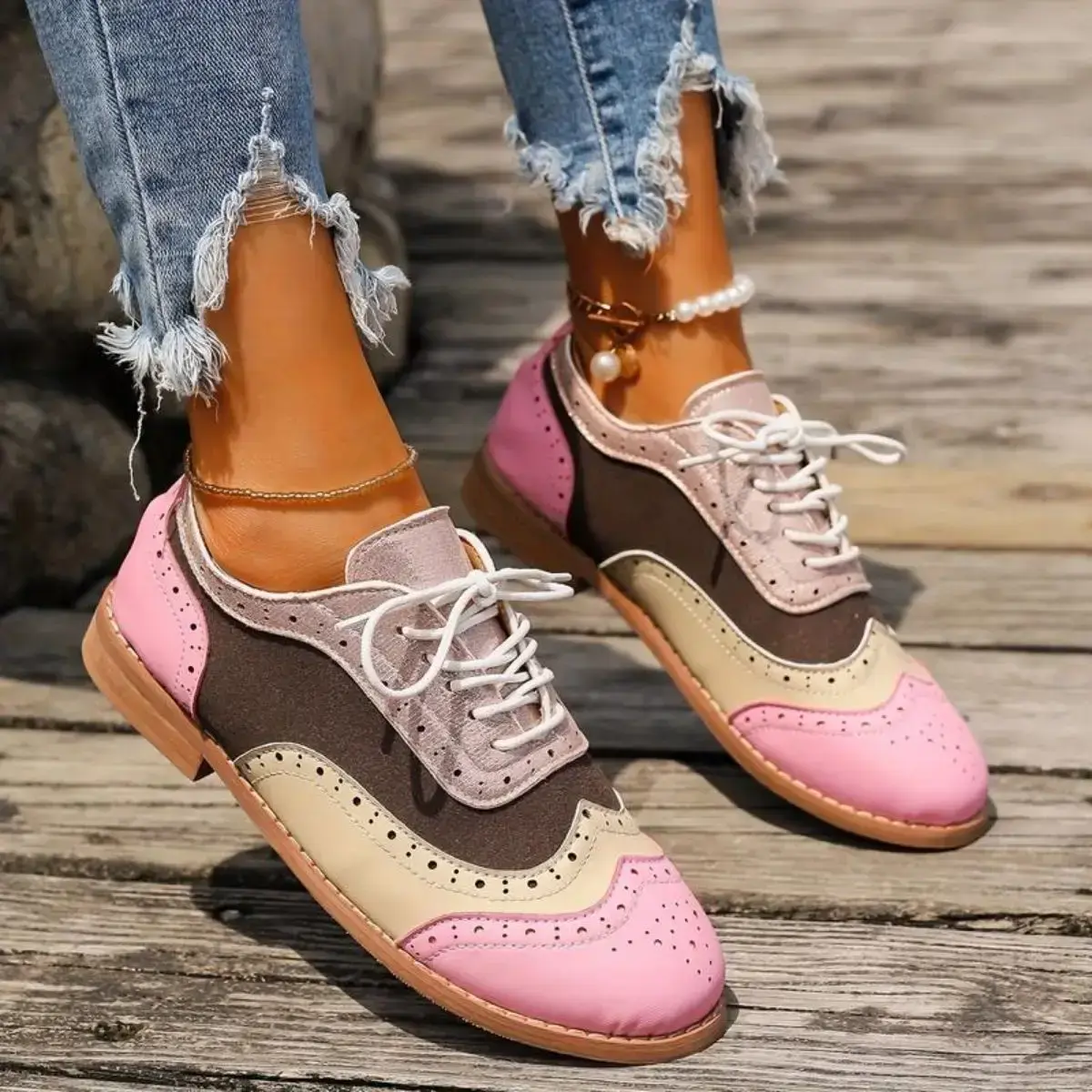Women's ColorBlock Oxford Flats, Elegant Brogue Comfort Shoes, Versatile Lace-up Shoes, Suitable for Daily Wear Girl Brown Pink Footwear