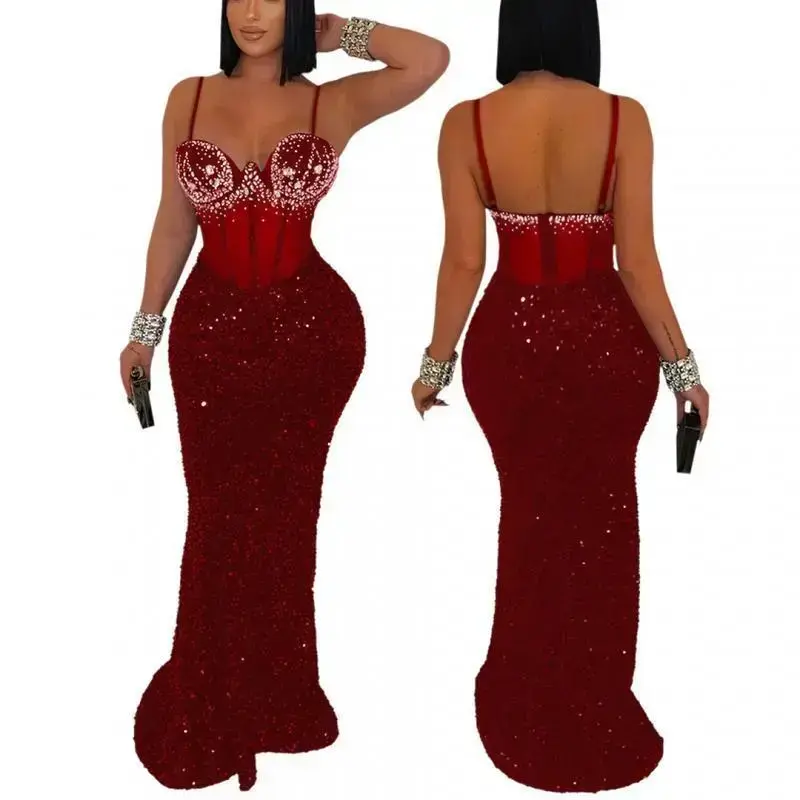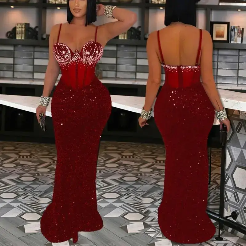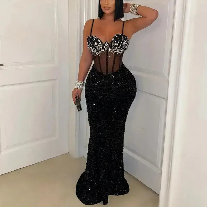 Women's Prom dress,Velvet sequin party dress, strappy dress with hotfix rhinestones, bodycon long dress for women.