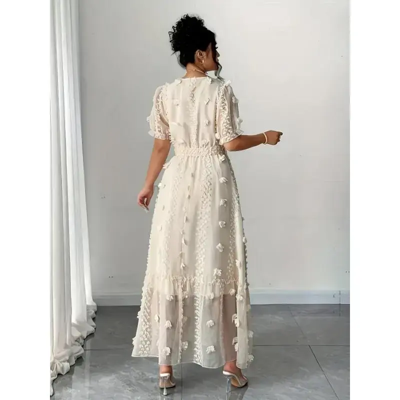 Women'SElegantV-NeckLongSleeveDresswithPuffSleevesandTieWaist-BeigeFloralLaceOverlay,A-LineSilhouette,PerfectforSpring/Summer/AutumnVacations,VacationAttire|FloralDress|PolyesterFabric,CasualFit