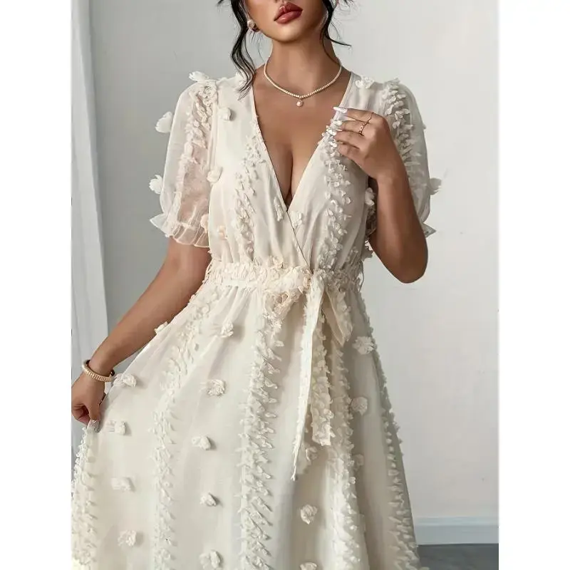 Composition:100%Polyester Material:Polyester Length:Longlength Belt:Yes SleeveLength:ShortSleeve SleeveType:RegularSleeve Details:Laceup Pattern:Solidcolor ApplicablePeople:Adult Sheer:Semi-Sheer DressesLength:Longlength Type:Fitted Contour:A Season:Spring/summer OperationInstruction:Machinewashorprofessionaldryclean Style:Vacation FitType:Regular FabricElasticity:NoElasticity PrintingType:NoPrinting WeavingMethod:Woven CollarStyle:V-neck ItemID:KY2905748 Origin:Guangdong,China