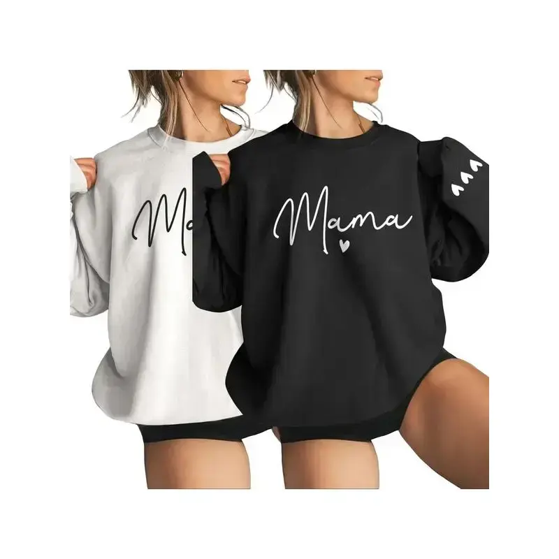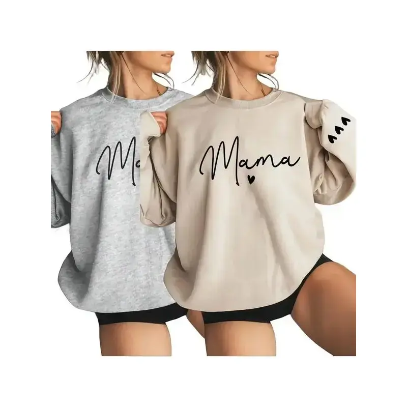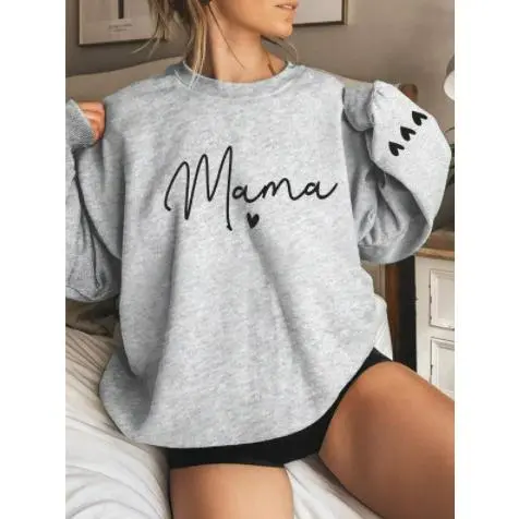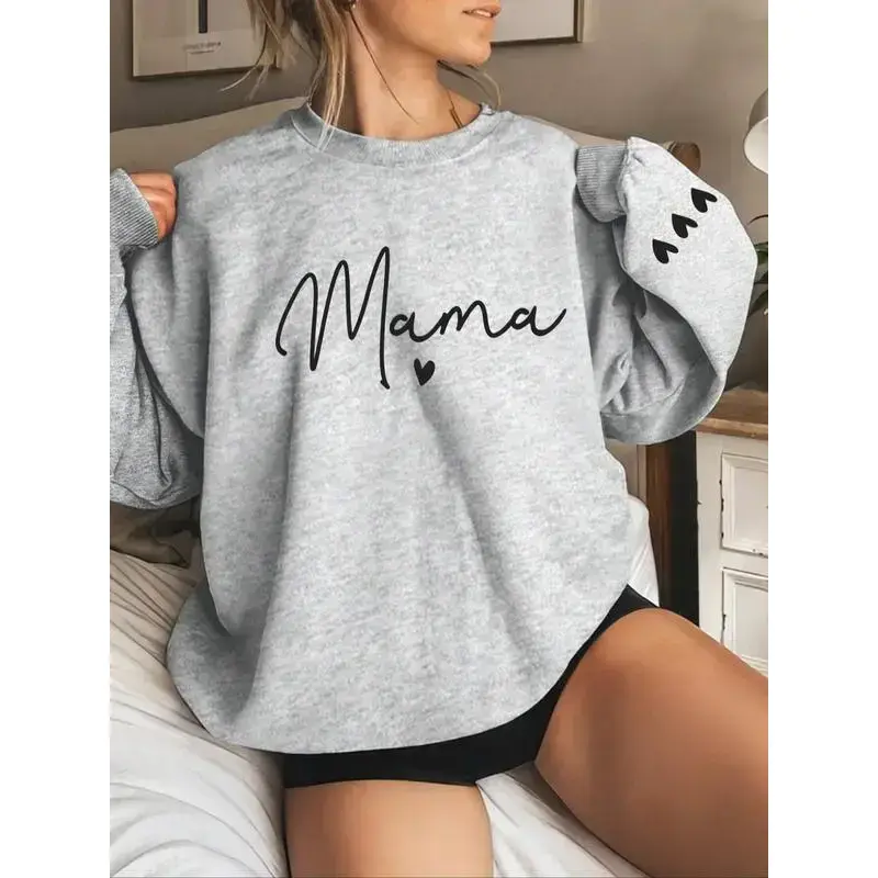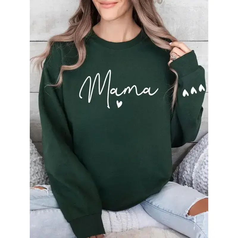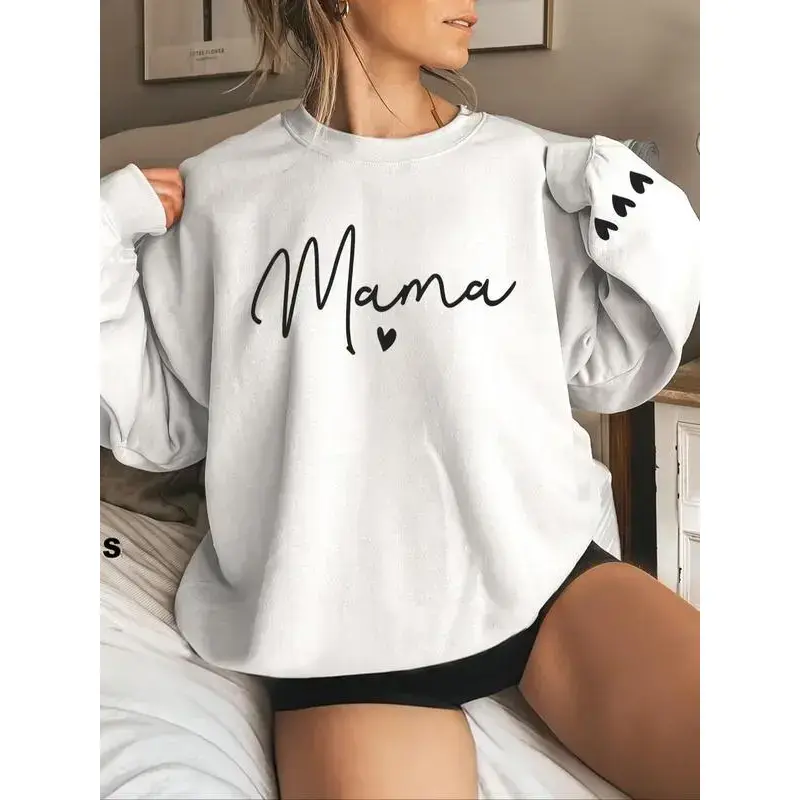 Women's Cartoon Mama Letter & Heart Print Pullover Sweatshirt, Casual Long Sleeve Crew Neck Pullover for Fall & Winter, Women's Clothes for Daily Wear