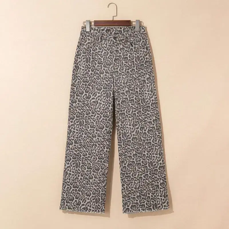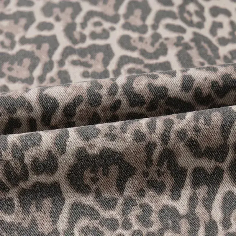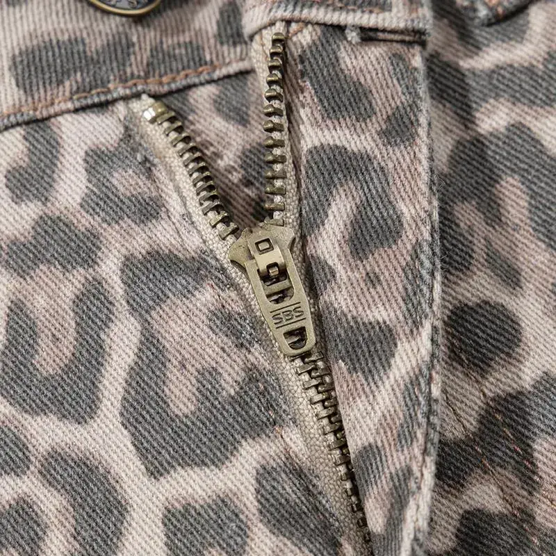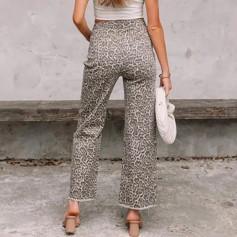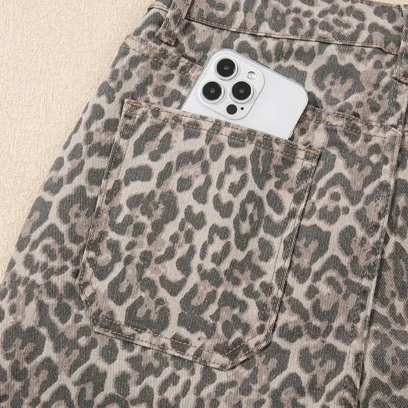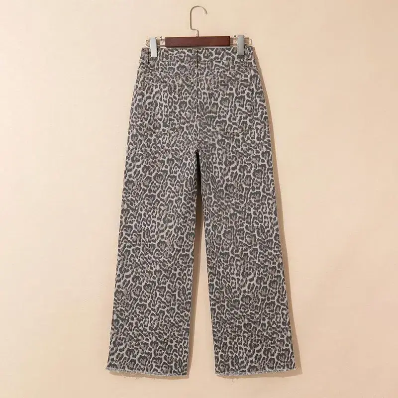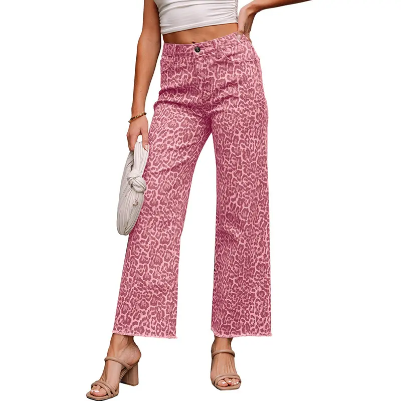 Rigid Twill Fabric Trendy Leopard Print Comfortable High Waist Design Modern Wide-Leg Style Raw Hem Premium Quality Denim