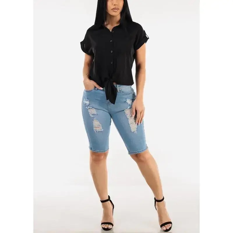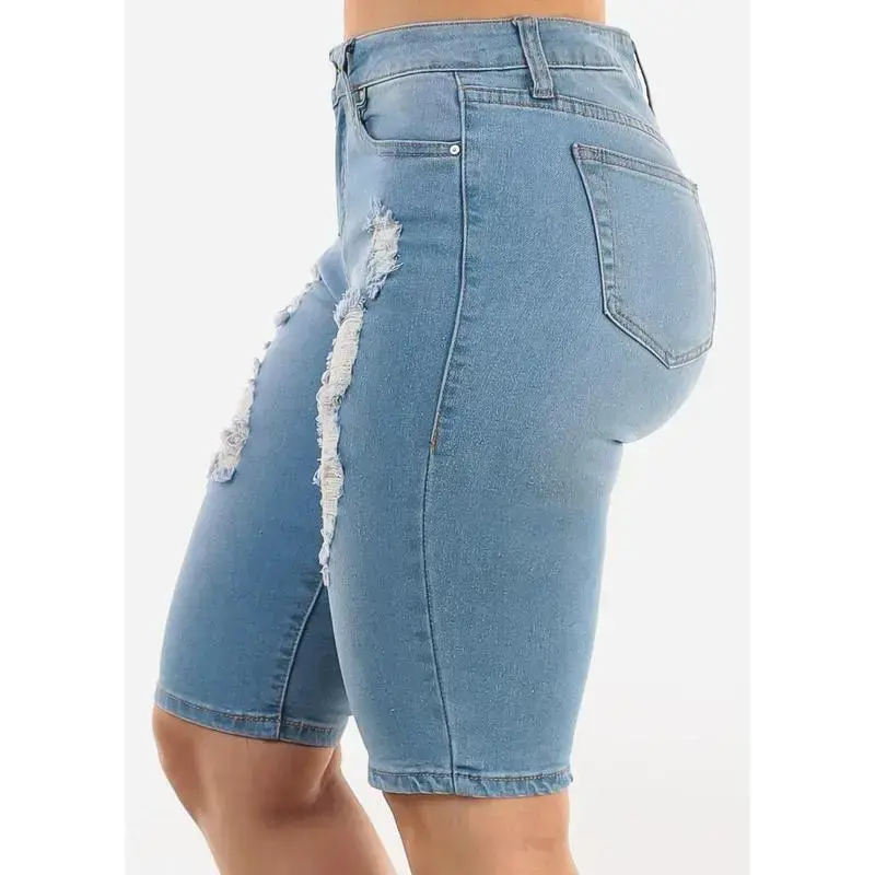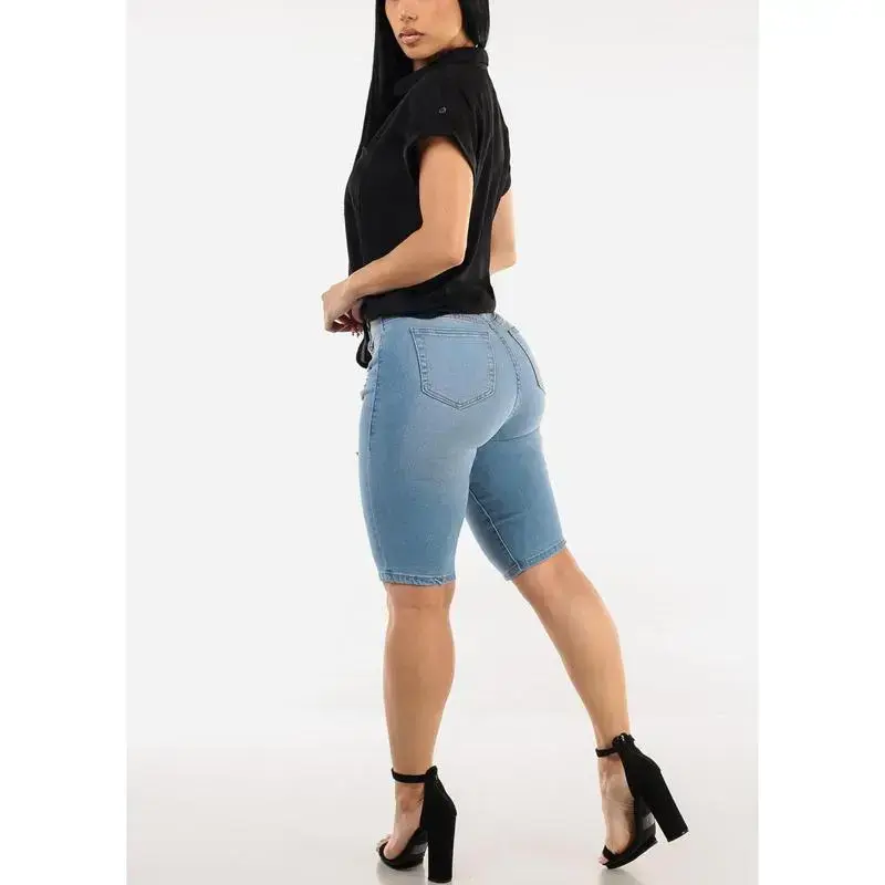 Stretchy Mid Rise Ripped Light Denim Bermuda Shorts