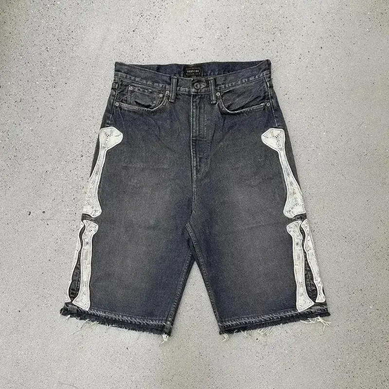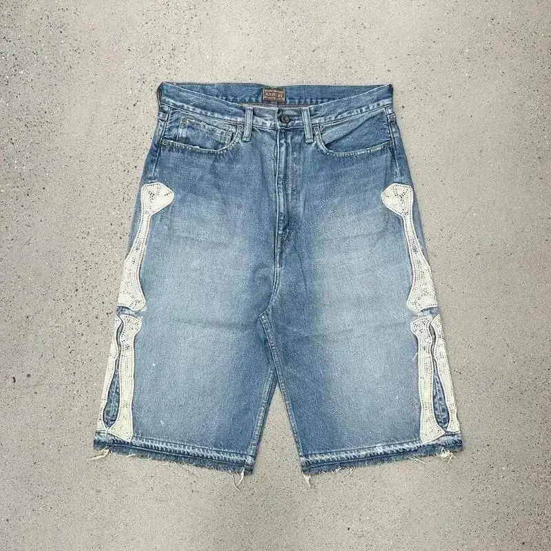 Harajuku Street Trend Bone Embroidery Five-point Jeans Men's Loose Straight Pants Washed Blue Jeans Summer Shorts for Men pants men
