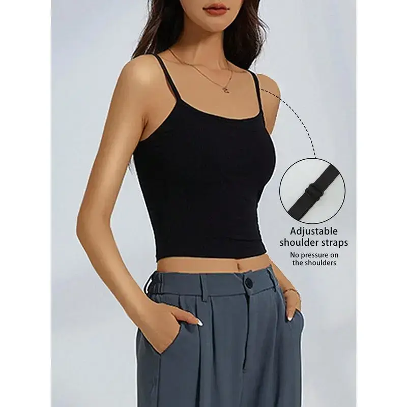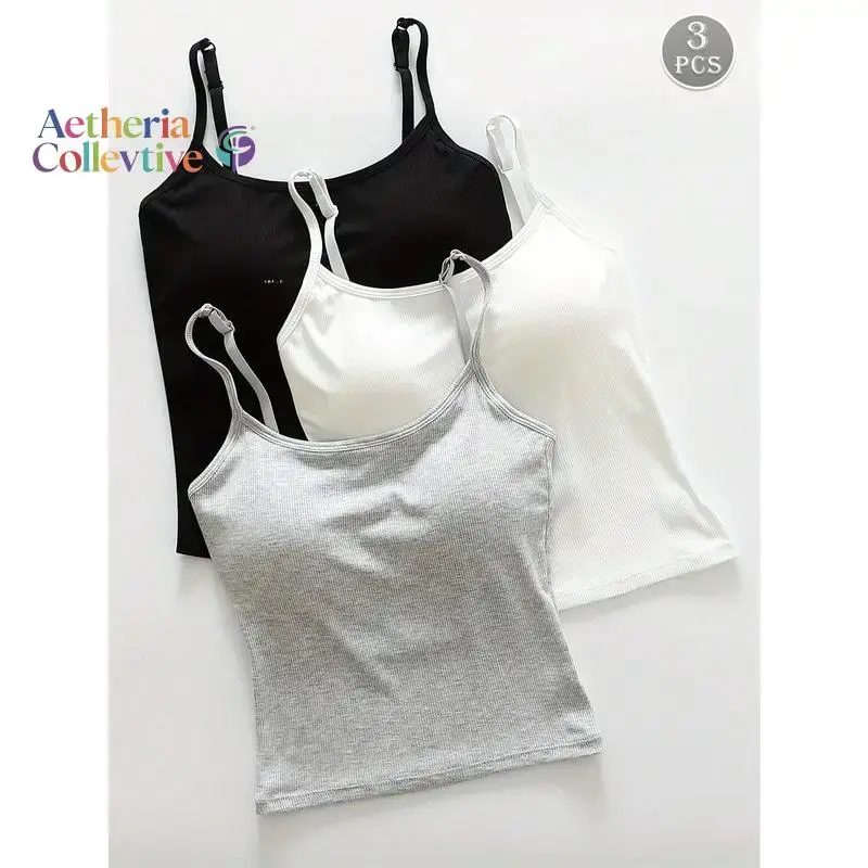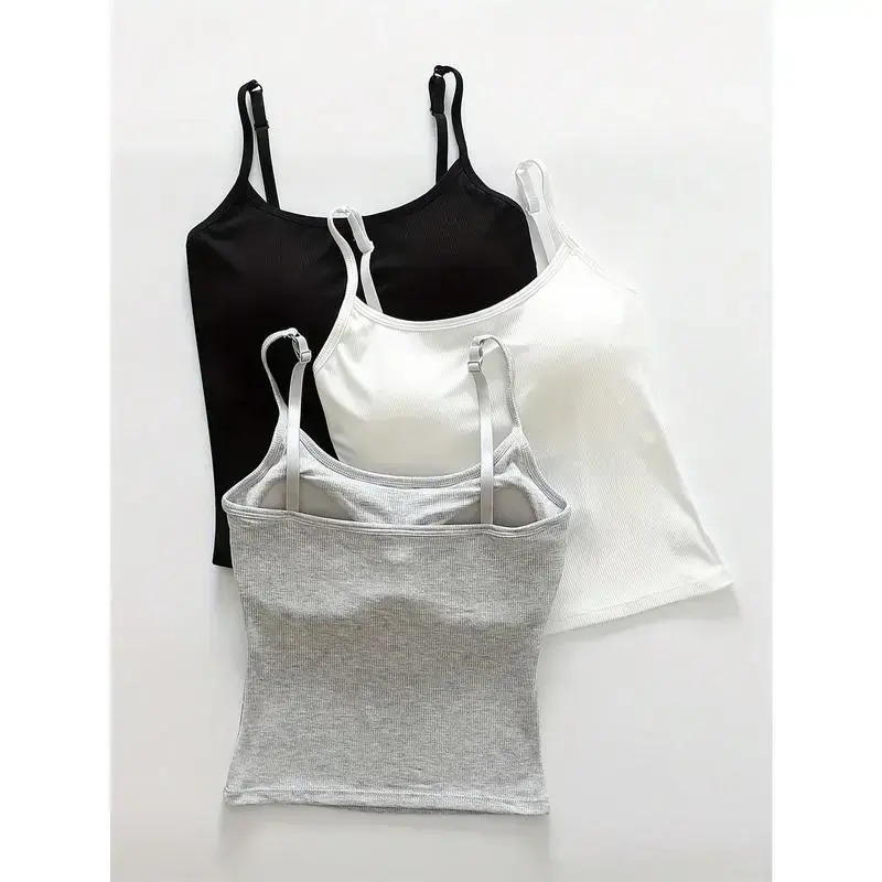 3pcs Women Plain Ribbed Camisole With Padded Bra, Casual Skinny Crop Top crew neck tank top Piece Womenswear Fashion
