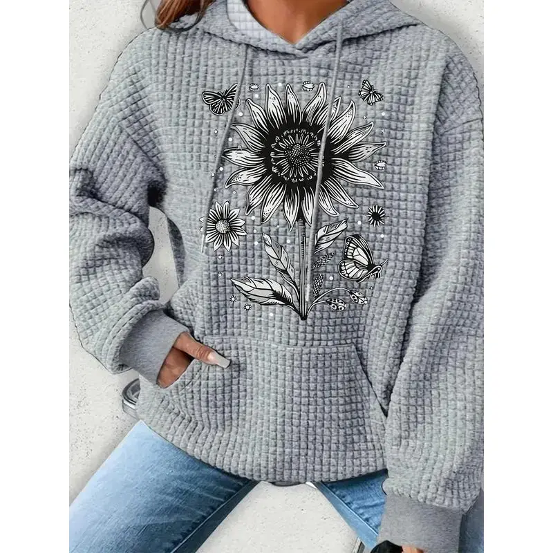 【Plus Size】 Floral Print Pocket Drawstring Hoodie, Casual Long Sleeve Hooded Sweatshirt for Fall & Winter, Women's Clothing for Daily Wear(gift)Gift