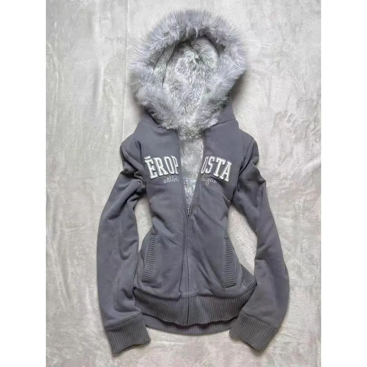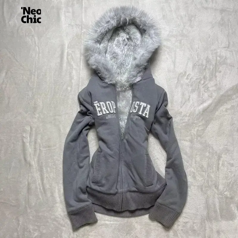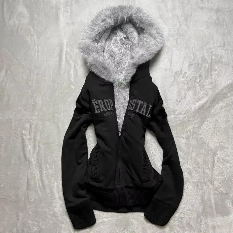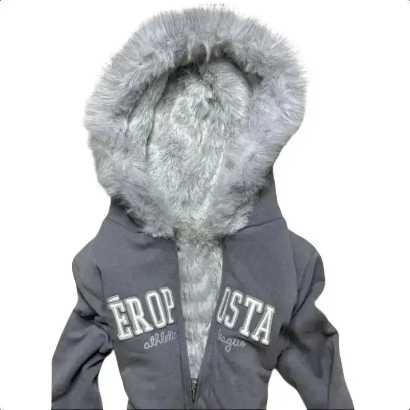 Women's Muted American Original Gray Thickened Hooded Sweatshirt Jacket Retro Slim Hottie Design Warm Zipper Jacket for Daily Wear Long Sleeve Casual Winter Tops