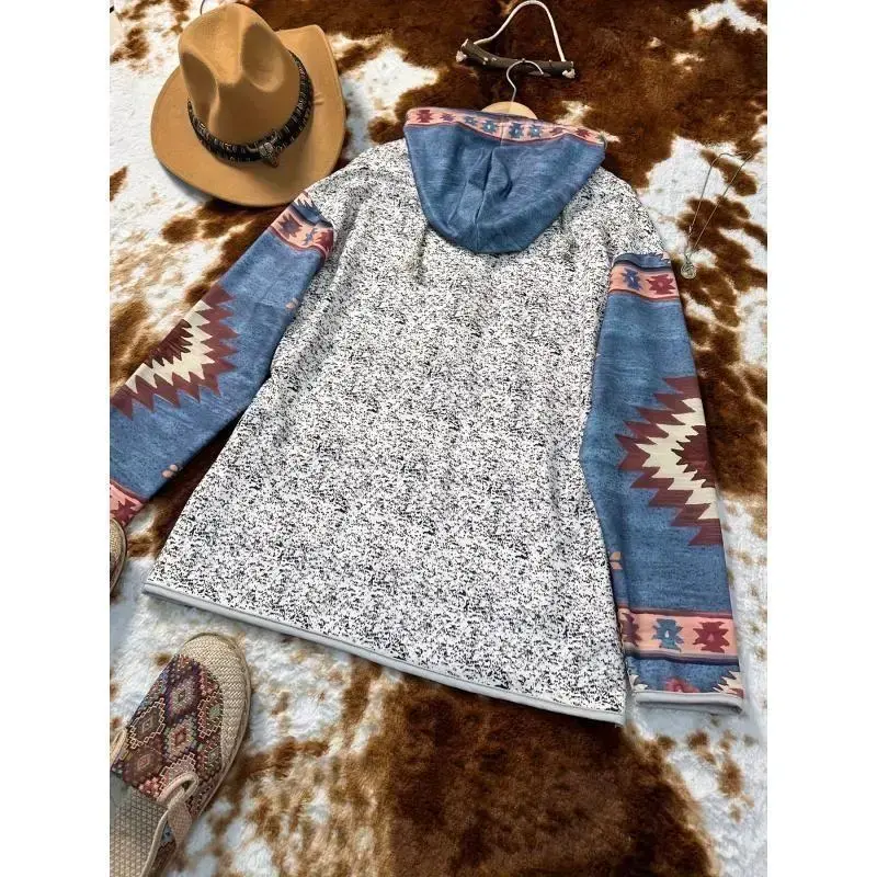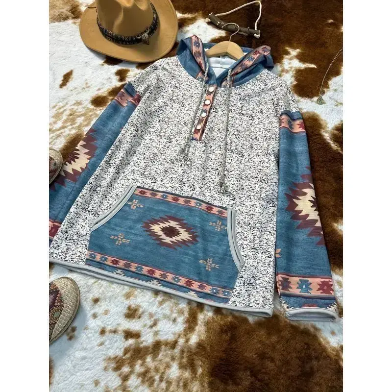 Women's Western Ethnic Style Printed Casual Hooded Sweatshirt Retro Snap Button Hoodie Women's Top Fashion Elegant Long Sleeve Women's ClothingGift