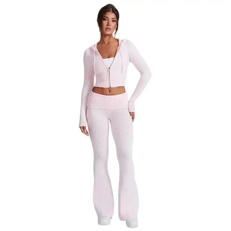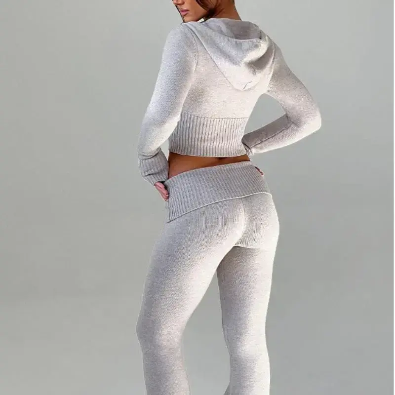 This cute set is a must for slipping on in the chilly seasons to come.Designed in soft stretchy ribbed knit fabric, this sweater set features an on trend flare legs and matching cropped hoodie./The hoodie is ribbed on the cuffs and waist, hooded with adjustable drawstrings and also features an zipped up front.The bottom is designed with a ribbed rollover waist, and a buckle accent./This two piece outfit is designed to flatter every body and to be worn for seasons to come! An essential for your off-duty wardrobe./Hand Wash/ Dry Clean recommended.