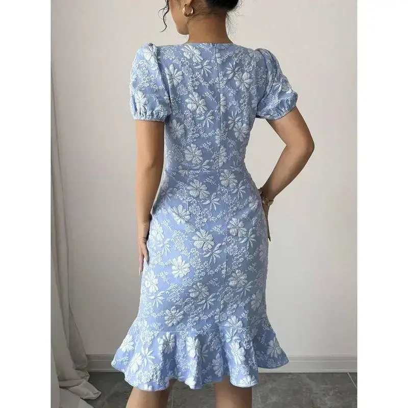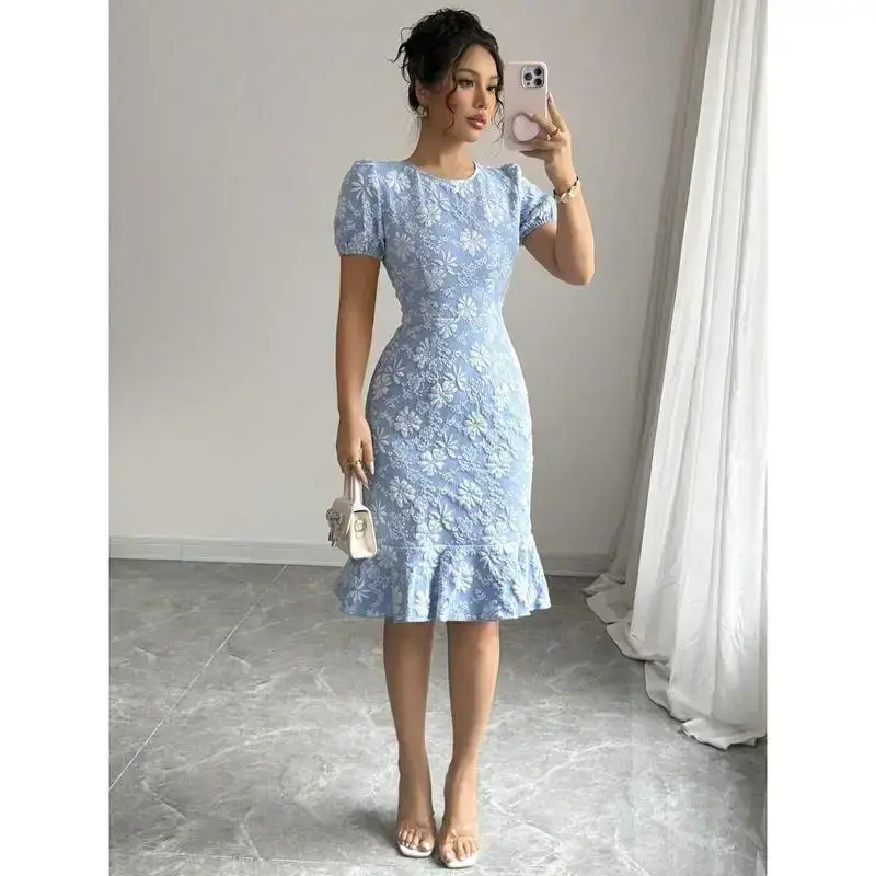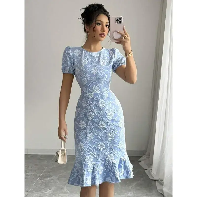 2025 Spring Summer Women's Summer Elegant Jacquard Texture Solid Color Round Neck Ruffled Skirt Puffy Sleeve Mid-Length Dress